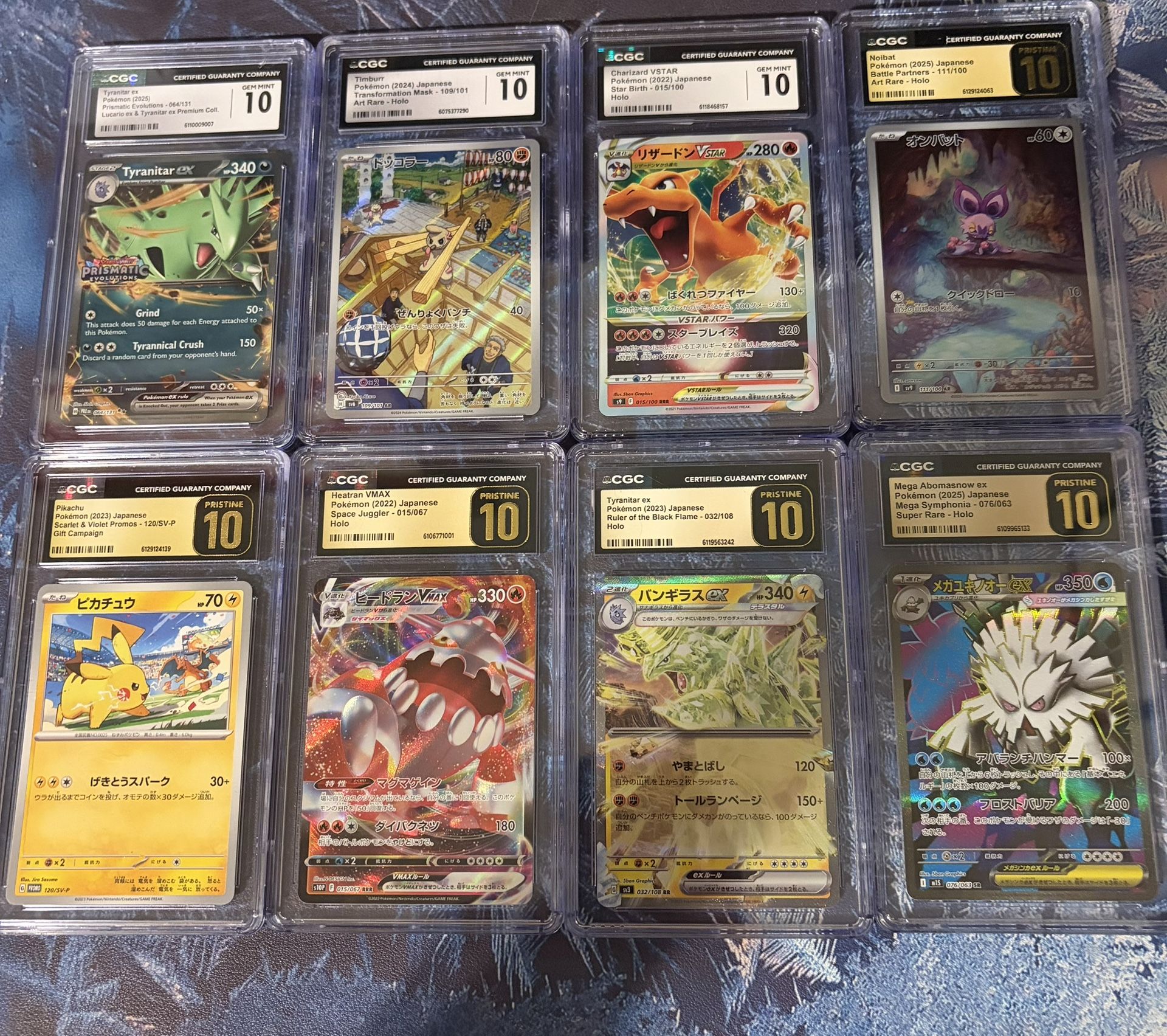 8 CGC graded Pokémon slabs. 5 Pristine 10s and 3 Gem Mint 10s. Most cards are Japanese. Includes: Pikachu SV Promo (JP) – Pristine 10 Tyranitar ex – Pristine 10 Noibat AR (JP) – Pristine 10 Mega Abomasnow ex (JP) – Pristine 10 Heatran VMAX (JP) – Pristine 10 Charizard VSTAR (JP) – Gem Mint 10 Timburr AR (JP) – Gem Mint 10 Tyranitar ex (Prismatic Evolutions) – Gem Mint 10 Selling as a lot. Open to offers, or trades for sealed pokemon cards.