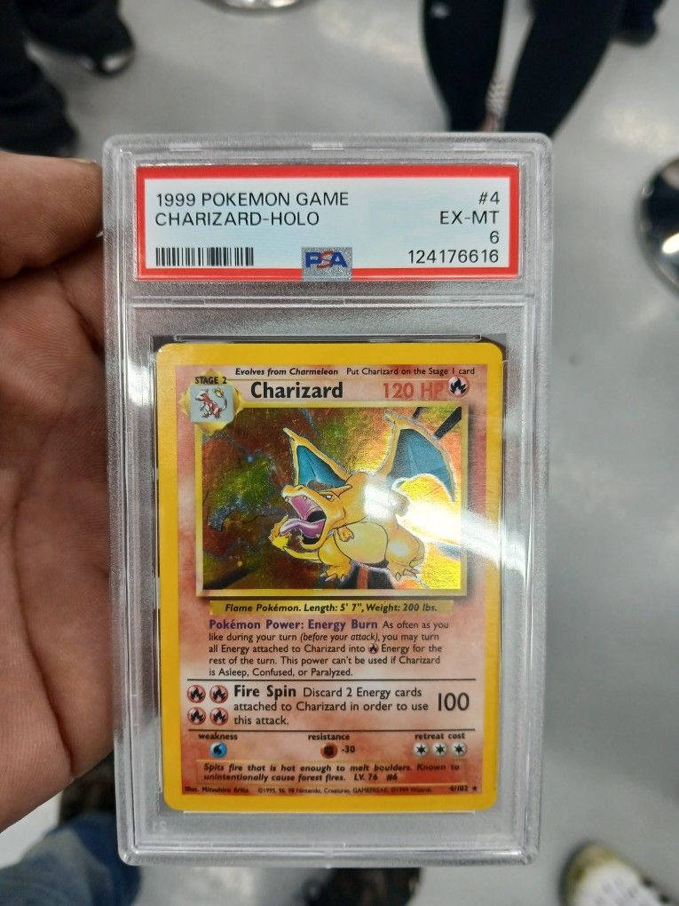 The 1999 Pokémon Base Set Charizard Holo 4/102 card is a highly sought-after collectible item for fans of the Pokémon franchise. This vintage card features Charizard, a Fire-type Pokémon with 120 HP, in a holographic finish. Manufactured by The Pokémon Company in the United States, this English-language card is graded as a PSA 6 EX-MT, making it a rare find for collectors. The iconic Charizard design by Mitsuhiro Arita adds to the appeal of this classic card from the Base Set.