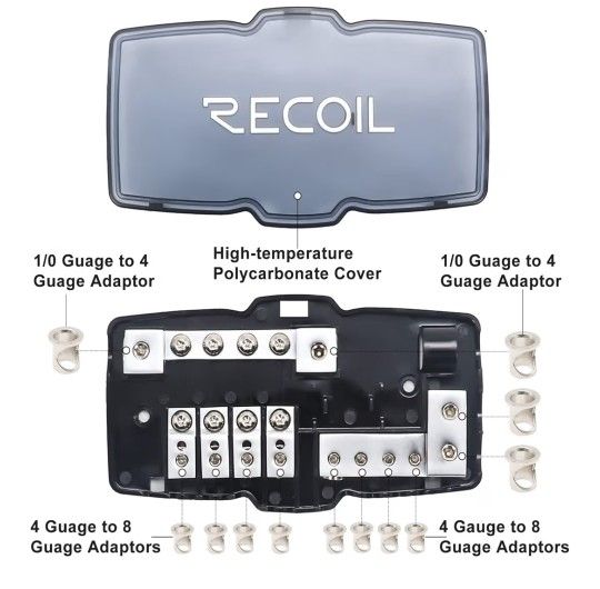 Connector TypeScrew Number Of Contacts64 Mounting TypeDIN Rail Mount MaterialBrass, Polycarbonate (PC) BrandRECOIL Number Of Poles4 High Performance 4-Way Mini-ANL Fused Distribution Block and Ground Block, Each Power and Ground Block has 4 X 0/2/4 Gauge In, 4 X 4/8 Gauge Out Branch the Main Power Wire to Connect Multiple Amplifiers or Devices. And Ground Multiple Amplifier or Devices together Positive and Negative Block Two-in-One Design with 4X60A, 4X80A, 4X100A Fuses Forged and Machined Brass Construction for Maximum Power Transfer. Marine-grade Satin Chrome Finish for Superior Corrosion Resistance A High-temperature Polycarbonate Base and Cover Provide Insulation and Protection