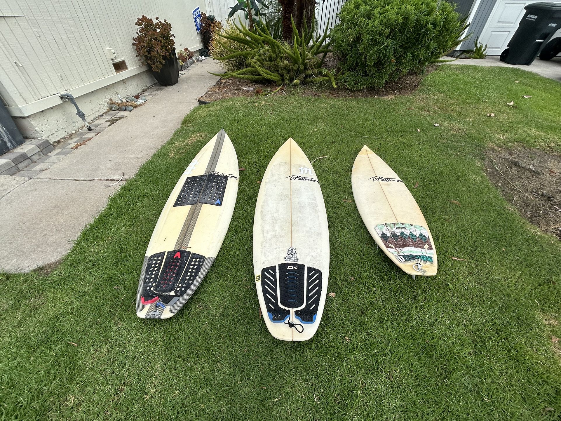 3 T Patterson Surf Boards. 1:5’9 (No fins) 2:6’0 (Fins Included, the one with design) 3:4’9 (Fins Included) You can buy together or separately. (I will sell to best offer)