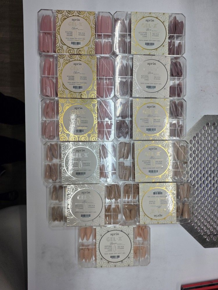 This lot is new old stock of Aprés Gel-X, Kokoist and kiara sky nail gel extension systems. Also included is new old stock of the original Aprés refill packs, if you hate the new fit of the tips and miss the old wider cuticle area. Chaun Neutrals Sculpted Square XXLONG x2 300pcs total Chaun Neutrals Tapered Coffin XL 150pcs Lila Neutrals Natural Stiletto Long 150pcs Alex Neutrals Natural Stiletto Long 150pcs Alex Neutrals Sculpted Coffin Long 150pcs Alex Neutrals Sculpted Square Long 150pcs Maisie Neutrals Natural Stiletto Long 150pcs Mia Neutrals Sculpted Square Long 150pcs Mia Neutrals Sculpted Coffin Long 150pcs Mia Neutrals Natural Stiletto Long 150pcs Tokyo Spice Heart Square Medium 250pcs Tokyo Spice natural Round Medium 250pcs Chaun Legend Sculpted Taperd Coffin XL 250pcs Chaun Legend Sculpted Taperd Coffin Long 250pcs Chaun Legend Sculpted Square XXLONG 250pcs Sculpted Coffin Long 500pcs Sculpted Almond XL 168pcs Sculpted Round Long 280pcs Natural Round Long x2 560pcs total Sculpted Round Short 500pcs Sculpted Stiletto Medium 500pcs Natural Coffin Long x2 1000pcs total ART ME by Tokyo Natural Stiletto Long in Vivid Color 500pcs ART ME by Tokyo Natural Coffin Medium in Base Color 500pcs ART ME by Tokyo Sculpted Round Medium in Base Color 500pcs ART ME by Tokyo Natural Stiletto Long in Base Color 500pcs ART ME by Tokyo Natural Stiletto Medium in Base Color 500pcs Renee Natural Round Medium Charm 275pcs Aditional refill bags, new and original fit: 51 bags Kiara Sky Almond Medium Gelly tips x2 1000 pcs total Kokoist: Oval Long Oval short Coffin Long Almond Medium
