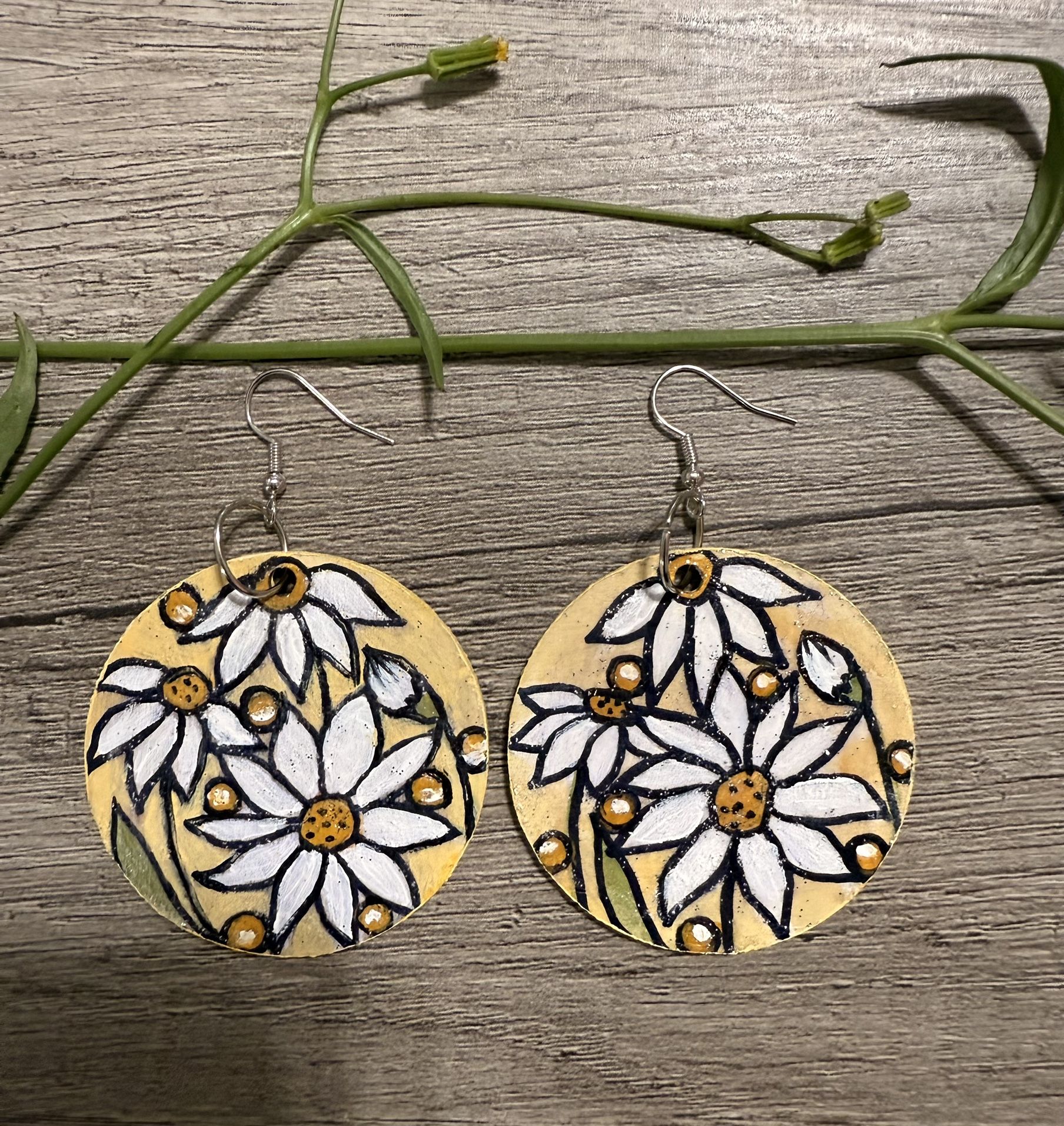 These one of a kind earrings are crafted one at a time in my home studio and composed of floral acrylic mini painting on round pieces of wood and stainless steel ear needles. The wooden handpainted statement earrings with daisy flowers are an artsy accessory for anyone who wants to underline his style with a touch of uniqueness. They are fashionable earrings for women, suitable for daily wear and all seasons. The colorful circle earrings enhance any outfit and are particularly comfortable to wear as they are very light. Note: All my items are handmade, so there might be variations to each pair. The circle wooden piece diameter: 2 in/5 cm Weight: 5g/0.17 oz