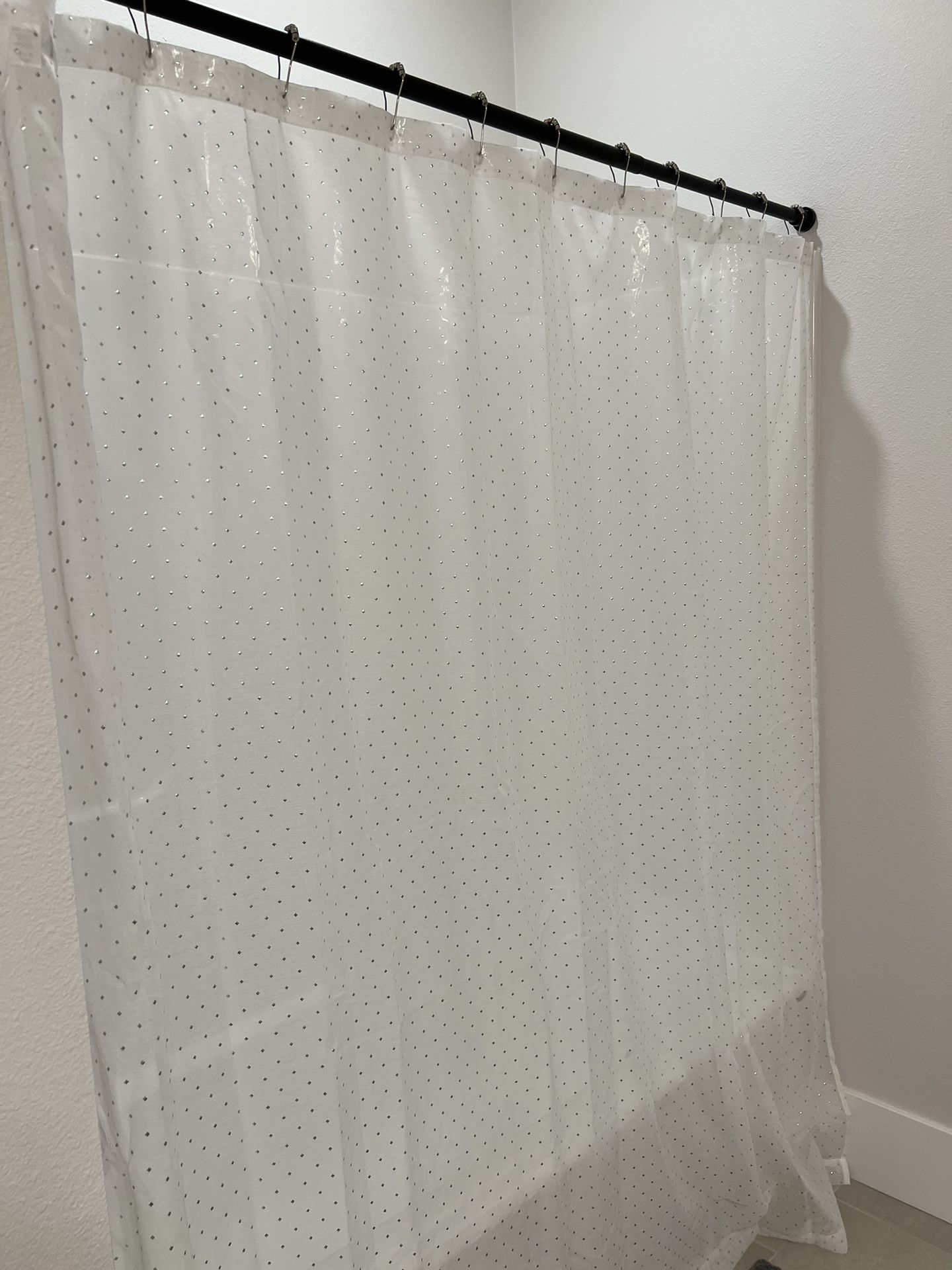 Very beautiful light filtering shower curtain. White with silver dots, comes with the curtain rings. Used only in guest bath so it’s in perfect condition. Use with plastic liner. Purchased from Nordstrom