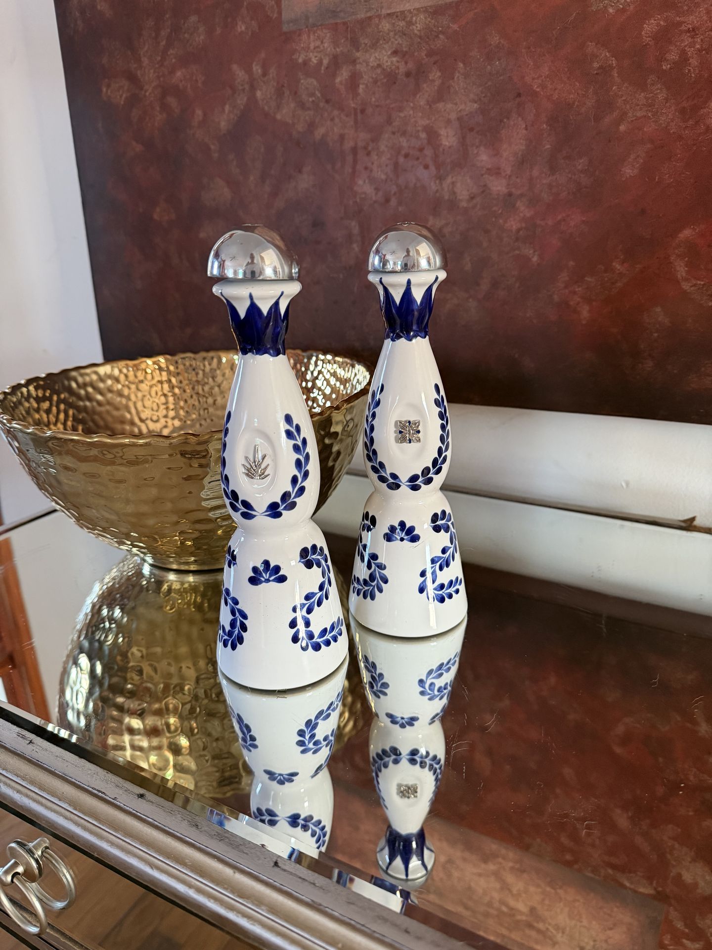 No alcohol just the collective smallest class azul decanters - 200 ml - rare The items in the image are iconic Clase Azul Reposado Tequila ceramic decanters. Handcrafted Art: These distinctive white ceramic bottles are handcrafted and individually hand-painted by artisans in Mexico, featuring intricate blue floral and leaf patterns. Collectible Design: Due to their artisanal nature and unique appearance, the decanters are highly sought after by collectors, often kept long after the tequila has been consumed. Distinctive Features: Each bottle is topped with a silver-plated dome cap and features a specific emblem, such as a silver agave leaf or a small star, which varies by bottle.