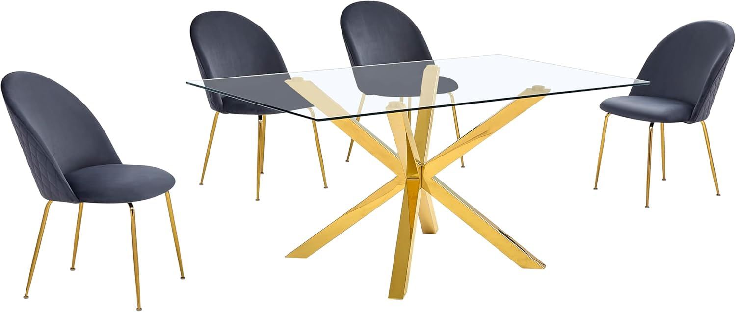 (no table) c-fu03018 Color Dark Gray Velvet Brand Best Quality Furniture Size 1 Table + 4 Velvet Chairs Item Weight 164.5 Pounds Style Contemporary, Glam About this item Gold Stainless Steel Table Base 10mm Tempered Glass Table Top Gold Chrome Finish Iron Chair Legs Velvet Upholstery