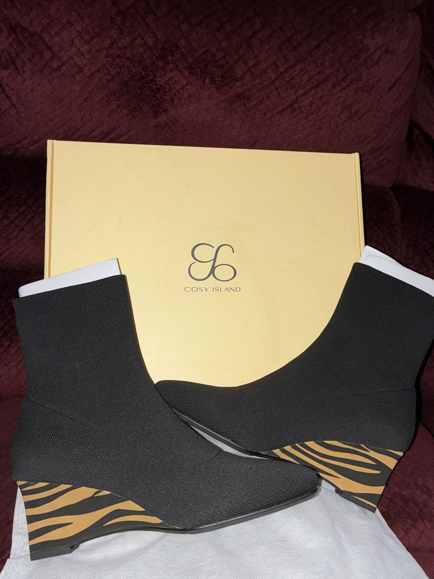 Cosy Island women's knit ankle boots with a unique zebra-print wedge heel. Size 6