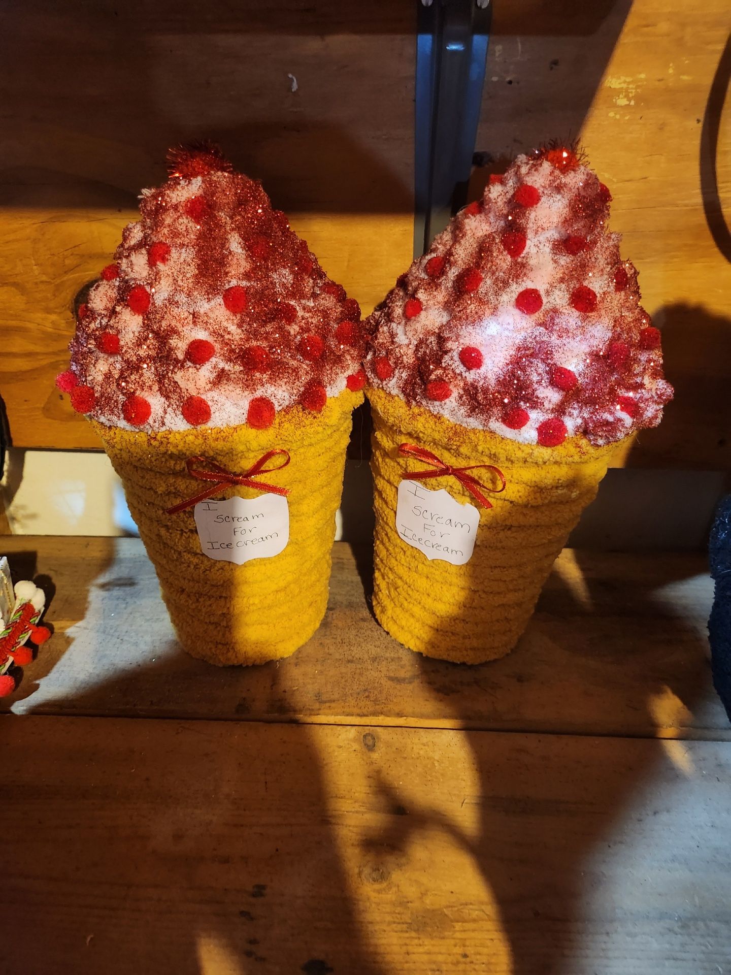 Cardboard,yarn,styrofoam… raspberry ice cream cones item price plus shipping $20 for the pair of cones.