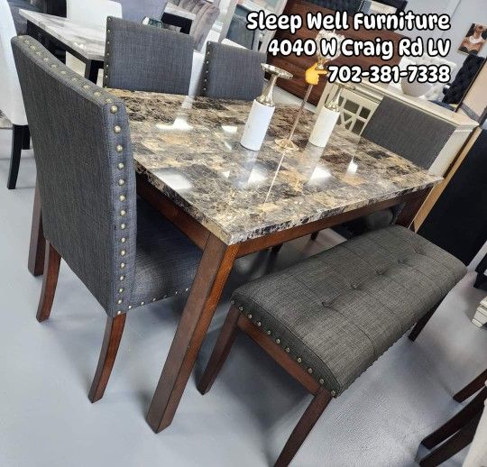 Brand new 6 piece Dining table chairs and bench 👉👉$499 👉NOW! (Originally $700) 🙋‍♂️👉SLEEP WELL FURNITURE 4040 W CRAIG RD LAS VEGAS Open 10-7pm Hablamos Español 👉We offer Financing💲 Take home it Home 👉$50 DOWN No credit required, Zero interest up to 120 days Select from Koalofi, Acima, Kornerstone, Kafene finance. Furniture Sectional Sofa Queen King Mattress Bedroom Bunk beds Dining table chairs