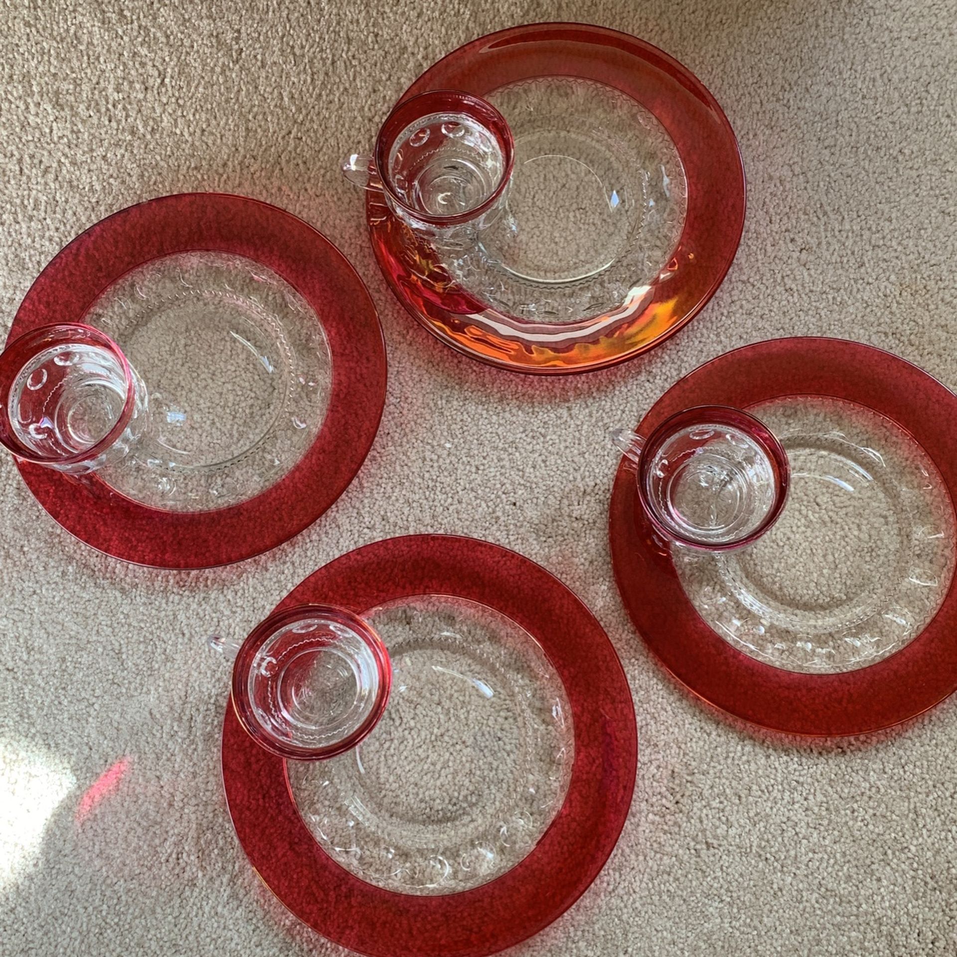 Vintage cranberry colored plates with cups more for luncheon they would be pretty for Thanksgiving beautiful condition no chips or scratches