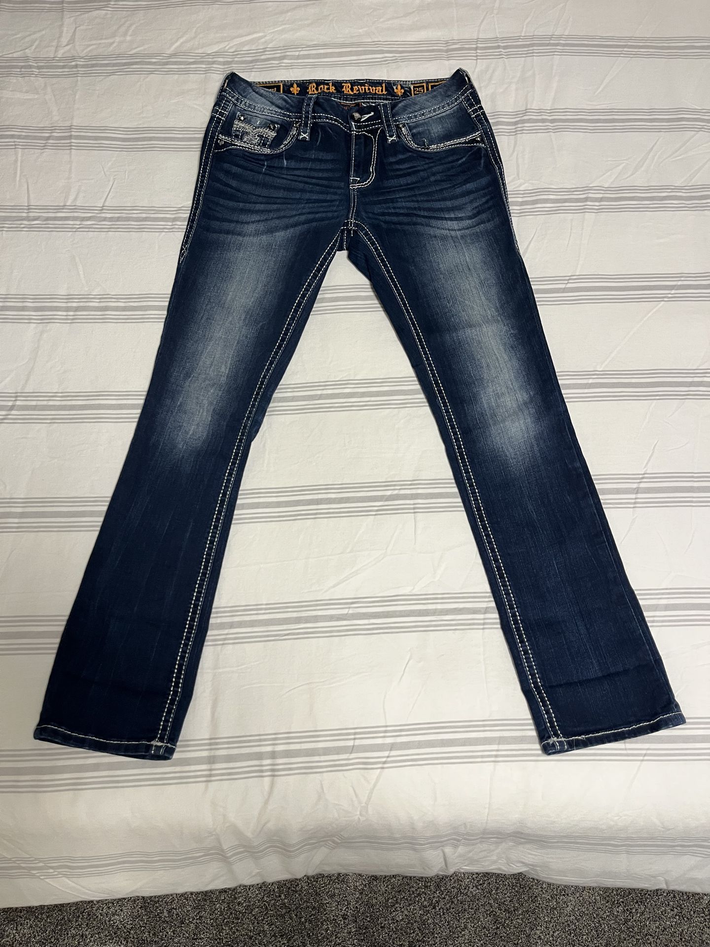 Rock Revival Claret Stylish Easy Straight jeans with contrast stitching. Perfect for casual wear. Size 25 Details: - Mid-Rise Straight- A classic mid-rise with a higher waistline, crafted with quality fabric for a premium fit and feel. - Mid-rise - 30" uncuffed inseam - Curvy fit, eased through the hip and thigh - 9" rise - Rhinestones on metallic embroidered faux flap back pockets ** Smoke & pet free home