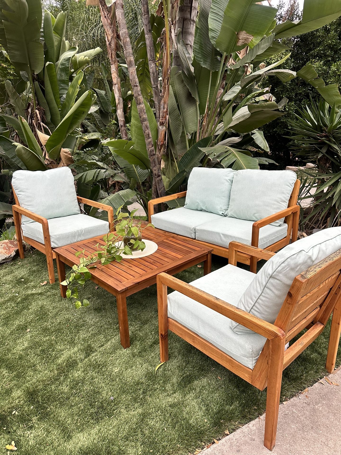 Selling 4-Piece Wood Outdoor Set with light blue cushions in a good condition. Very sturdy, nothing broken This is a big and deep seat, very comfortable with the thick cushions. This set comes with: • 1 Loveseat +cushions • 2 Armchairs +cushions • 1 Coffee Table • 1 set of rain Cover sheet **washable cushions Pick up in Bonita. Delivery: Available for an additional fee depending on distance.