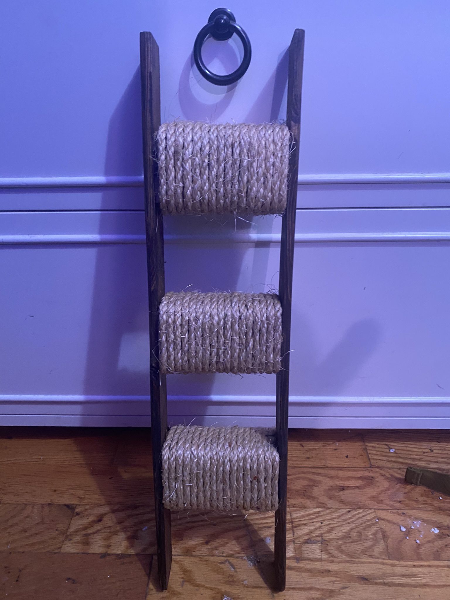 Homemade 3 step cat ladder. I have made multiple for my cats and they love them. The steps are wrapped with a nice scratch rope that is easily replaceable if the cats rip it up like mine do. The side wood is sanded smooth and finished with a Roanoke finish for the nice look.