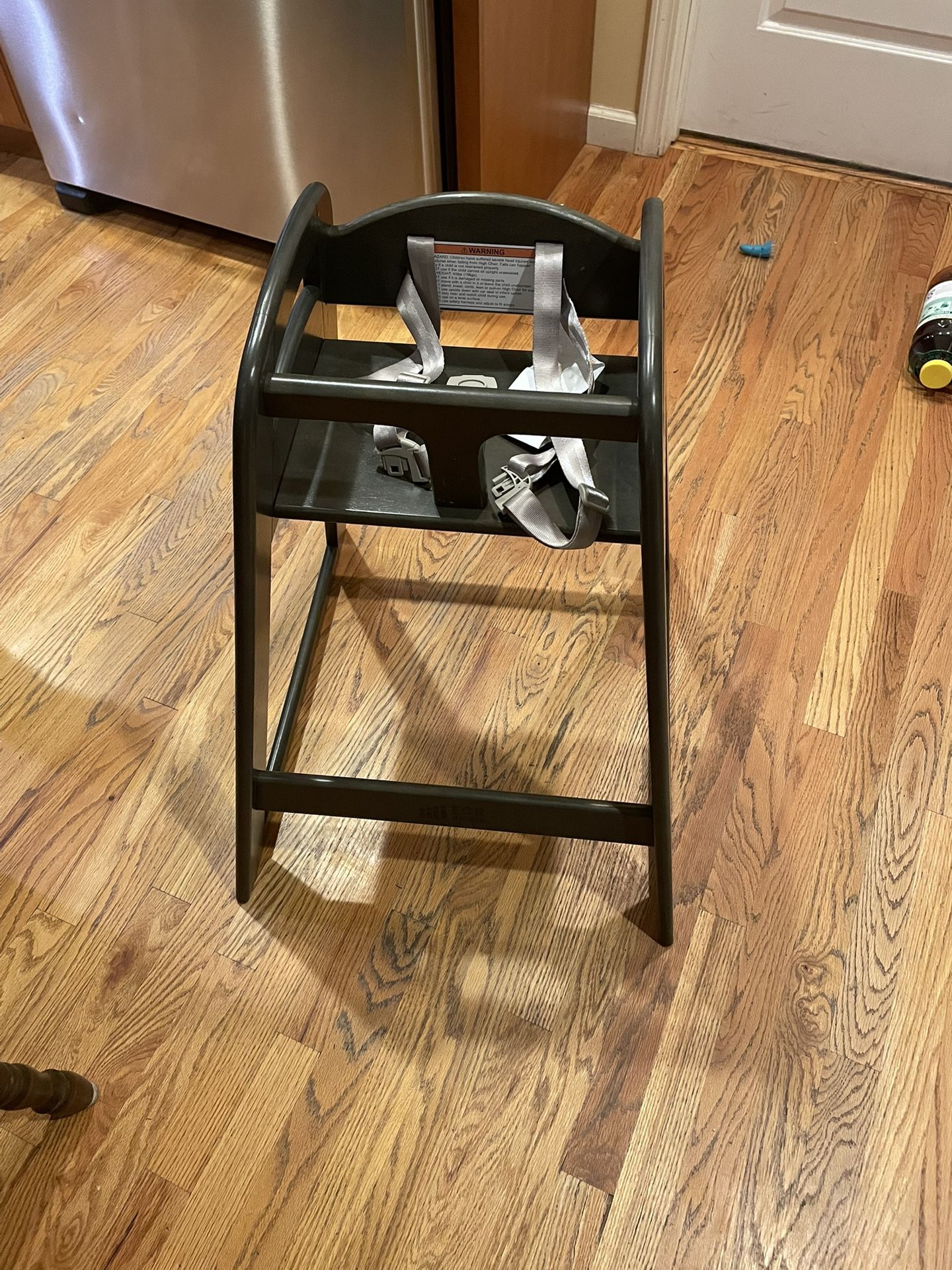 Wooden high chair in grey. Similar to high chairs at restaurants, no tray must be pulled up to table. Barely used. Used once or twice. 28” high Max weight 40lbs 2 chairs available. $35 each or best offer.