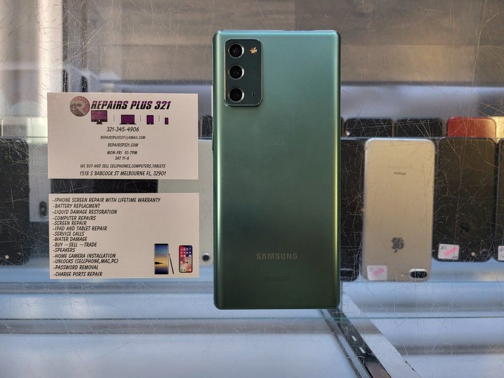 We have a green unlocked Galaxy Note 20 128gb 5G for sale! It comes with a 60 Day Warranty! Charger included! We offer financing and we even give you a chance to extend the warranty to one year! Come Visit Repairs Plus 321! We have many other iPhones, Samsung, Macbooks, and Apple Watches for sale!