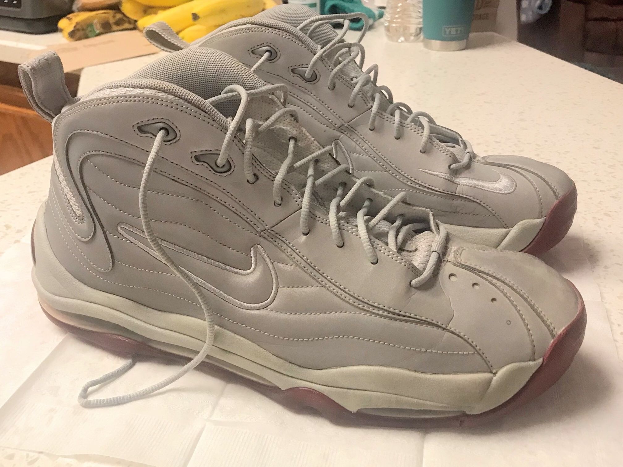 These are a great looking pair of Nike Reflective Air Total Max Uptempo 3M Attack Pack shoes, . They are in excellent condition, almost like new. These are well made durable shoes that are no longer available and sell over $450 when they were new. These come in a size 13. 366724 004 | metallic silver/metallic silver-team red are the colors. This pair will definitely stand out and catch your eye, as they feature a complete leather upper, which also sports a 3M reflective design. Nike decided to sit atop a grey midsole, and burgundy outsole, while the shoe also sports a full-length durable Air Max sole unit.