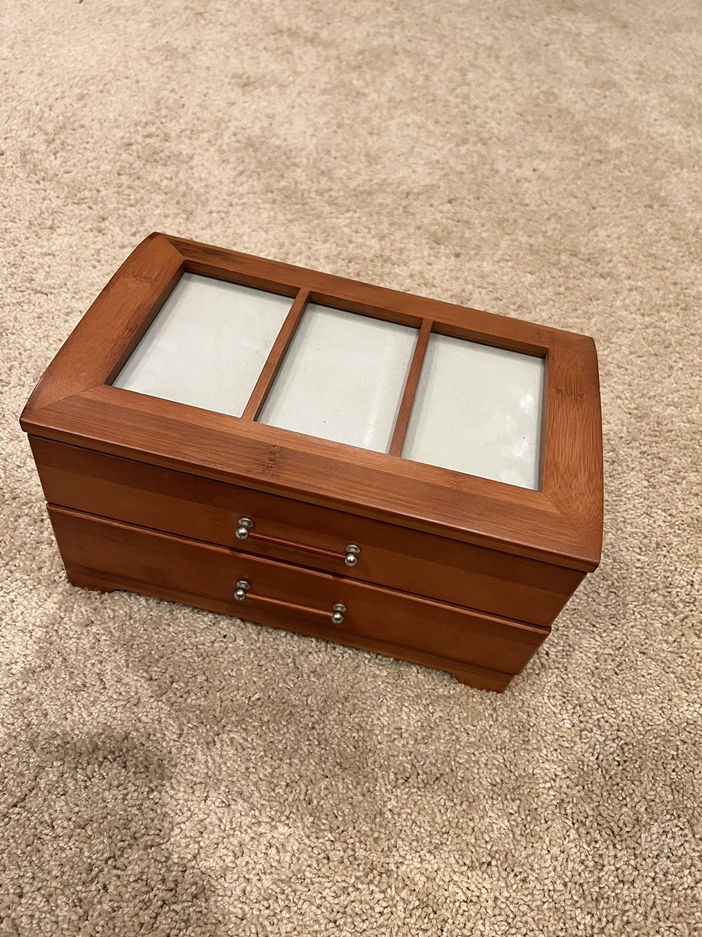 Mahogany-colored, two drawer jewelry box. Top part is glass and contains space for photographs. When opening the jewelry box, there is space for rings on the left, and little boxes on the right for bracelets or earrings. There is also another drawer for additional storage. The box is approximately 7x12x6.