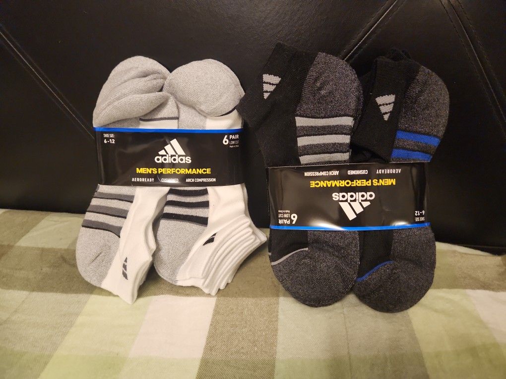 Brand New Adidas Socks : Shoe Size 6-12 Two packages : white socks and black 6 pairs in each package $25.00 per package I work during the day please be patient with my reply after work