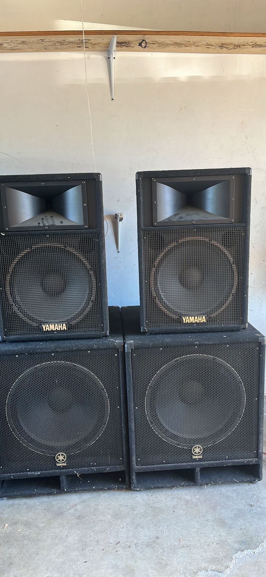 2 Yamaha S115IV passive speaker cabinet. It features dual 1/4" input jacks for parallel connection. The speaker has a nominal impedance of 8 ohms. It is rated for 250 watts continuous program power and 500 watts peak power handling. The speaker was manufactured in the USA.