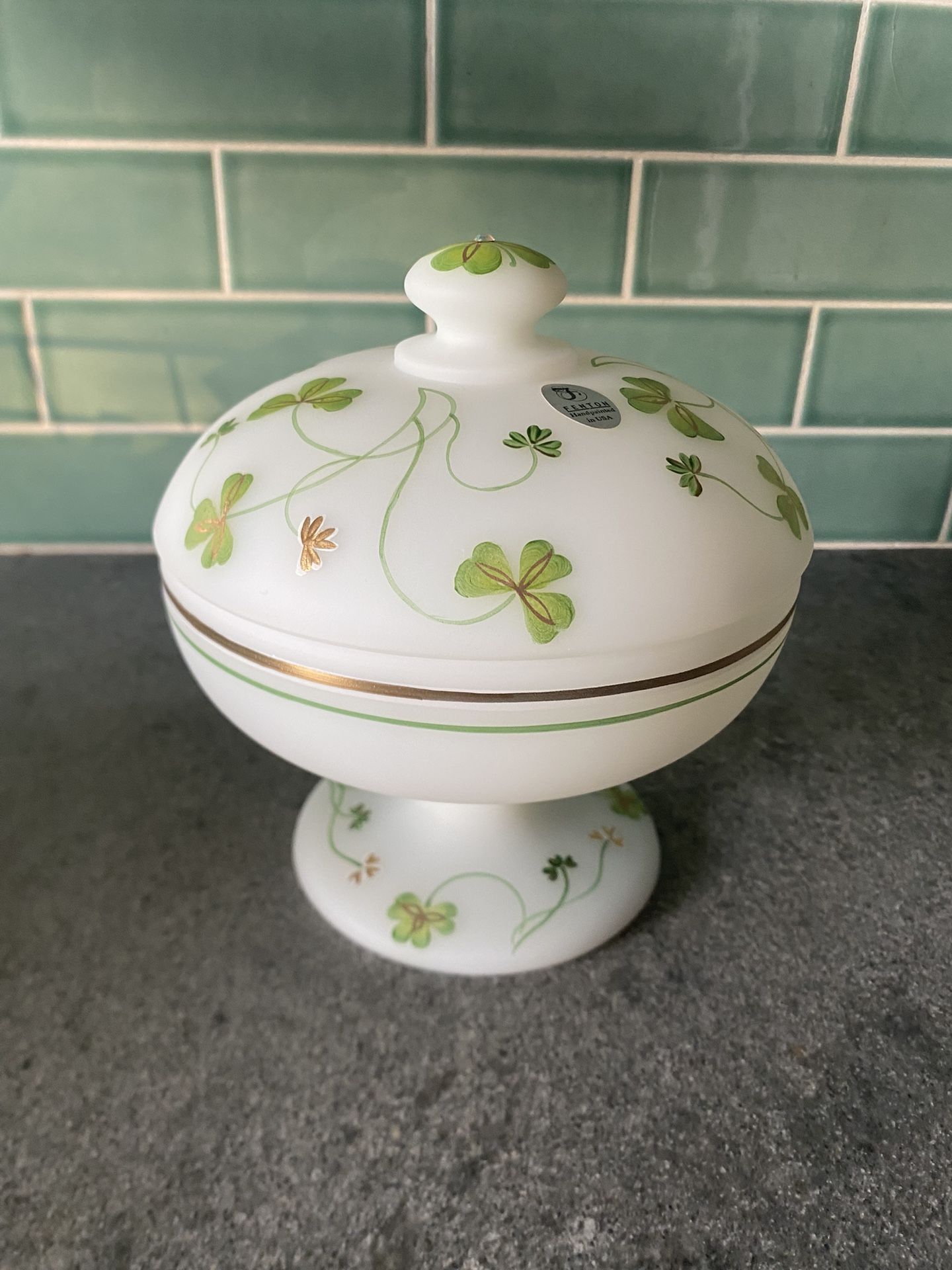 Fenton hand painted clover candy dish. White satin finish and signed by artist. No chips or cracks