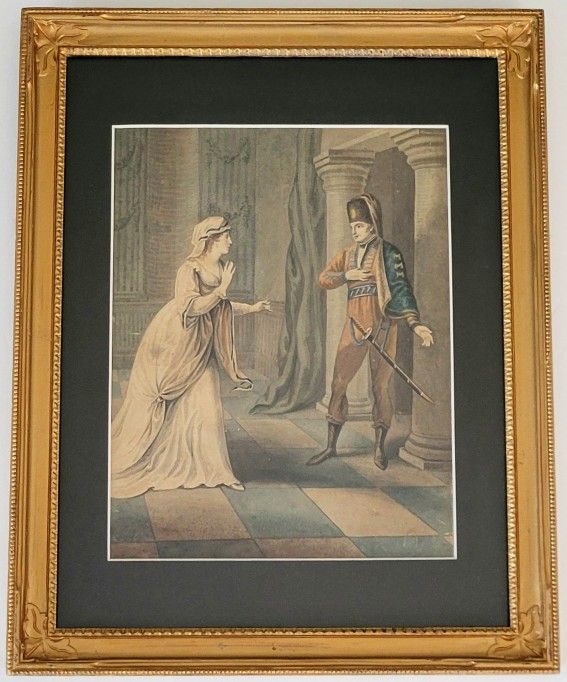 This charming vintage pre-Victorian scene engraving, measuring 11.5x15", captures an elegant early 19th-century moment with grace and sophistication. The artwork showcases a beautifully detailed interior, featuring classical columns, flowing draperies, and a striking checkered floor, framed by an ornate gold border. The figures, adorned in period attire, exude a sense of drama and refinement, making this piece a delightful glimpse into a bygone era. Framed size: 11.5” x 15” Local pick-up in Dana Point, CA; cash or Zelle only! Happy to answer any questions. Reasonable offers welcomed!