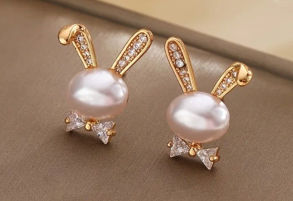 Elegant gold-tone bunny stud earrings featuring lustrous white pearls and a sparkling bow. Lightweight and feminine design for everyday wear or special occasions