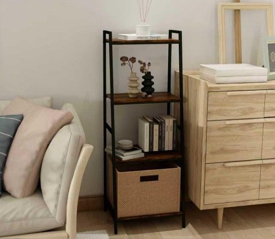 4 - Tier Ladder Shelf, Industrial Bookshelf with Metal Frame, Freestanding Plant Flower Display Rack for Living Room, Bedroom, Home Office, Brown