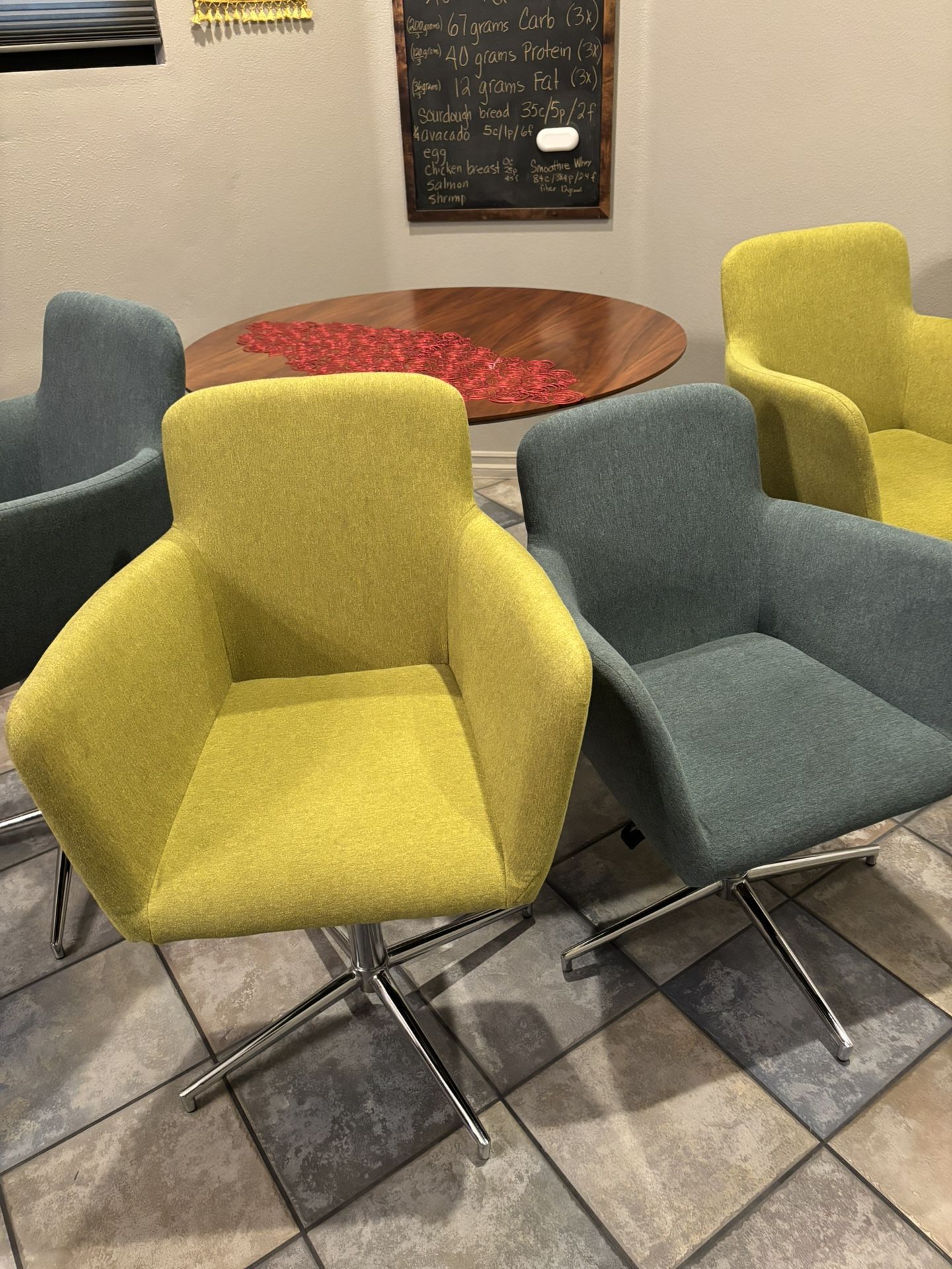Blue and chartreuse fabric dining chairs. Each chair swivels and is adjustable for a variety of heights . No significant stains. $20 for each chair or all four for $60