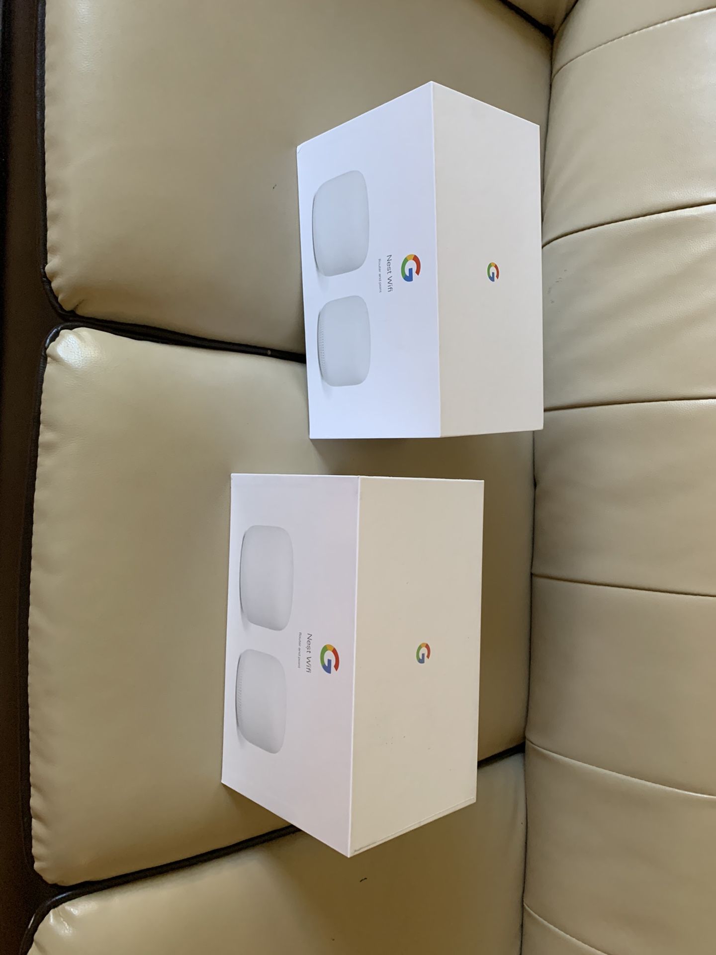 NEW in original factory sealed packing NEW Nest WiFi Router with 1 Point - Mesh Router for Wireless Internet - Wi-Fi Extender with Smart Speaker Includes one Nest Wifi Router and one Nest Wifi Point. Nest Wifi is a scalable and flexible Wi-Fi system. These Nest Wifi devices work together to blanket your whole home in fast, reliable Wi-Fi and eliminate buffering in every room – with coverage of up to 3800 square feet.[1,2] 1 Wi-Fi router plugs into your internet provider’s modem to create your Wi-Fi network. Each point extends the wireless network and keeps your connection fast to devices in every room.[1] Each Nest Wifi router and point is strong enough to handle up to 100 connected devices, and fast enough to stream multiple 4K videos at a time.[3] Compatible with Google Wifi. Two Ethernet ports are included on each router. 15W power adapter included.