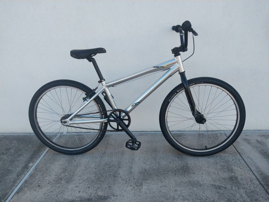 I am offering up for sale this 2008 Mid School Free Agent Ambush 24 BMX Cruiser Racing Bike 24" Bicycle. It consists of the following components: Free Agent Ambush 24 6061 Aluminum Alloy Frame with 22" Top Tube Free Agent 24 Chro-Moly Forks Free Agent Aluminum Threadless 4-Bolt Stem Aheadset Threadless Headset Tektro Brake Lever Tektro Rear Brake Caliper HARO Grips and Bar Ends Free Agent 2PC Handlebars Free Agent Seat Clamp Free Agent Clampless Aluminum Seatpost Free Agent Padded Saddle Seat (Small Tear) Free Agent 3PC 175mm Cranks VP Aluminum Platform Pedals 24" Aluminum Rims with FA Hubs TIOGA PowerBlock Tires (Rear could use replacing) The top tube length from center of steering tube to center of seatpost insert tube is 22 inches. Even though this bike is USED and shows signs of wear (Scratches here and there), it is still in overall good condition and rides great. Thanks for looking.