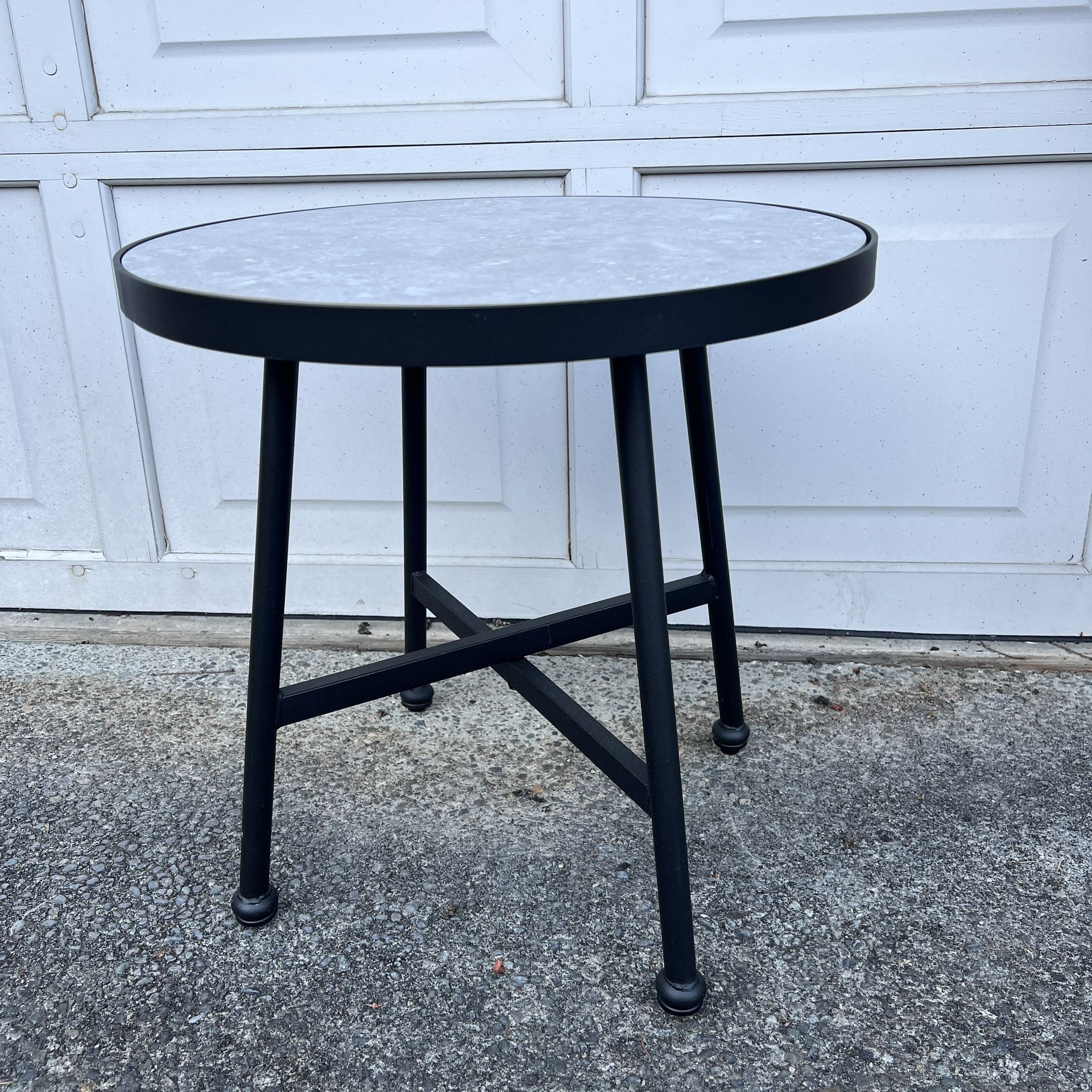 Grey white Marble stone top, Bistro Table side table black Iron metal steel shelf round Table. Great condition. 20" x 20" x 20" Fits everywhere, patio outdoor indoor end table coffee table If the ad is still posted, it's still available. Smoke free and Pets free. family friend holiday gift home office kitchen work birthday anniversary valentines house warming wedding valentine's day mother father Christmas Halloween Thanksgiving party chef guest moving downsizing college dorm apple apartment storage traveling vocation computer laptop cellphone google designer ikea dania dinning room university student college moving target Macy's Wayfair amazon Costco bravern graduation bedroom bathroom authentic
