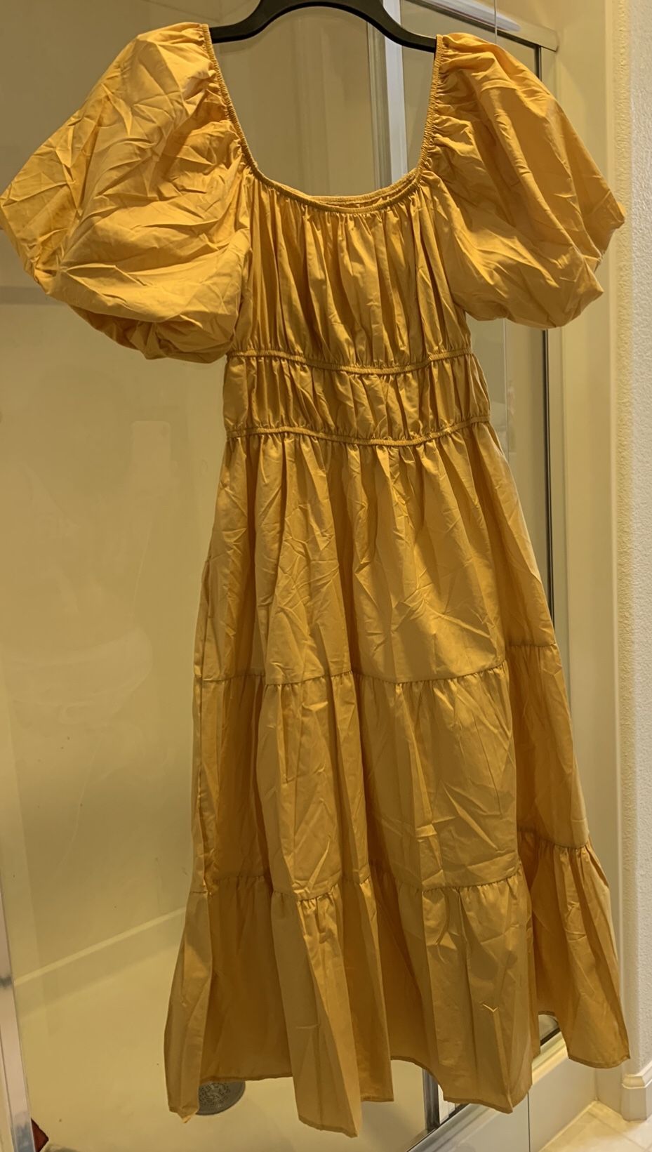 Yellow Off Shoulder Puffy Sleeve Tiered MIDI Dress. Large, NWT
