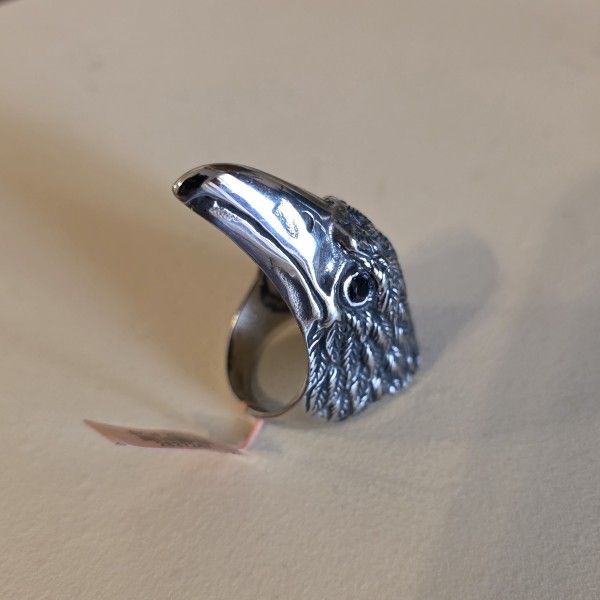 Bold, 3D eagle head statement ring. Crafted from high-quality, oxidized 316L stainless steel for a vintage aesthetic, this ring features intricate feather detailing and a sharp, lifelike beak. Set with striking black cubic zirconia eyes, this durable, hypoallergenic piece is the perfect accessory for bikers, rock enthusiasts, or anyone seeking a symbol of strength and vision