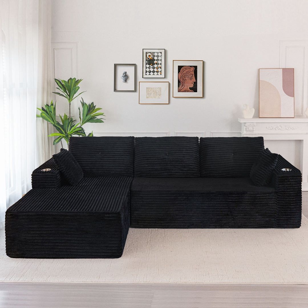 New 104" Modular Sectional Couch with L-Shape Chaise, Modern Boneless Couch for Living Room, Sofa in A Box, Oversized Sofa Sleeper with Deep Seat, No Assembly Required, Black New in box MAXYOYO * Modular Titan L Sofa Couch: The Modular Titan L Sofa Couch adopts modular splicing structure. Each module is individually moulded and can be split or combined at will, making it easy to cope with changes in space. Whether it's a compact flat or an open-plan living room, the layout can be adapted to utilise the space, which is convenient for you to read books, play games, watch TV and other leisure activities * No Assembly Required: No assembly required, after opening the package, place it in a ventilated and dry environment, wait for about 72 hours or so to be able to return to its original shape, meanwhile, gently pat each part to improve its elasticity and luster, you can enjoy a comfortable experience! * Handy Cup Holder & Side Pockets: The embedded cup holder design at the armrest makes it easy to hold a drink at your fingertips, so you don't need to leave your seat when watching a film or reading a book. Side invisible storage pockets cleverly integrate practical functions, can store magazines, remote control, eye masks, etc., always keep the space neat and orderly * Oversized Sectional Sofa: The total width of the boneless sofa is 104 inches, which means unlimited possibilities of luxurious space for family movie watching, gathering with friends, or spending time alone, and the size of the L-shaped section allows for a natural stretching of the legs to be transformed into a sofa bed for an afternoon nap * High-resilience Foam Filling: The sectional couch is filled with whole piece of high-density elastic sponge inside, providing good support and enjoying a cloud-like comfortable sitting experience. Backrests and pillows provide lumbar and neck support to relieve fatigue, relax your body and experience a relaxing rest time. The handmade tufted button craft highlights a light luxury texture and embodies the aesthetic of home comfort