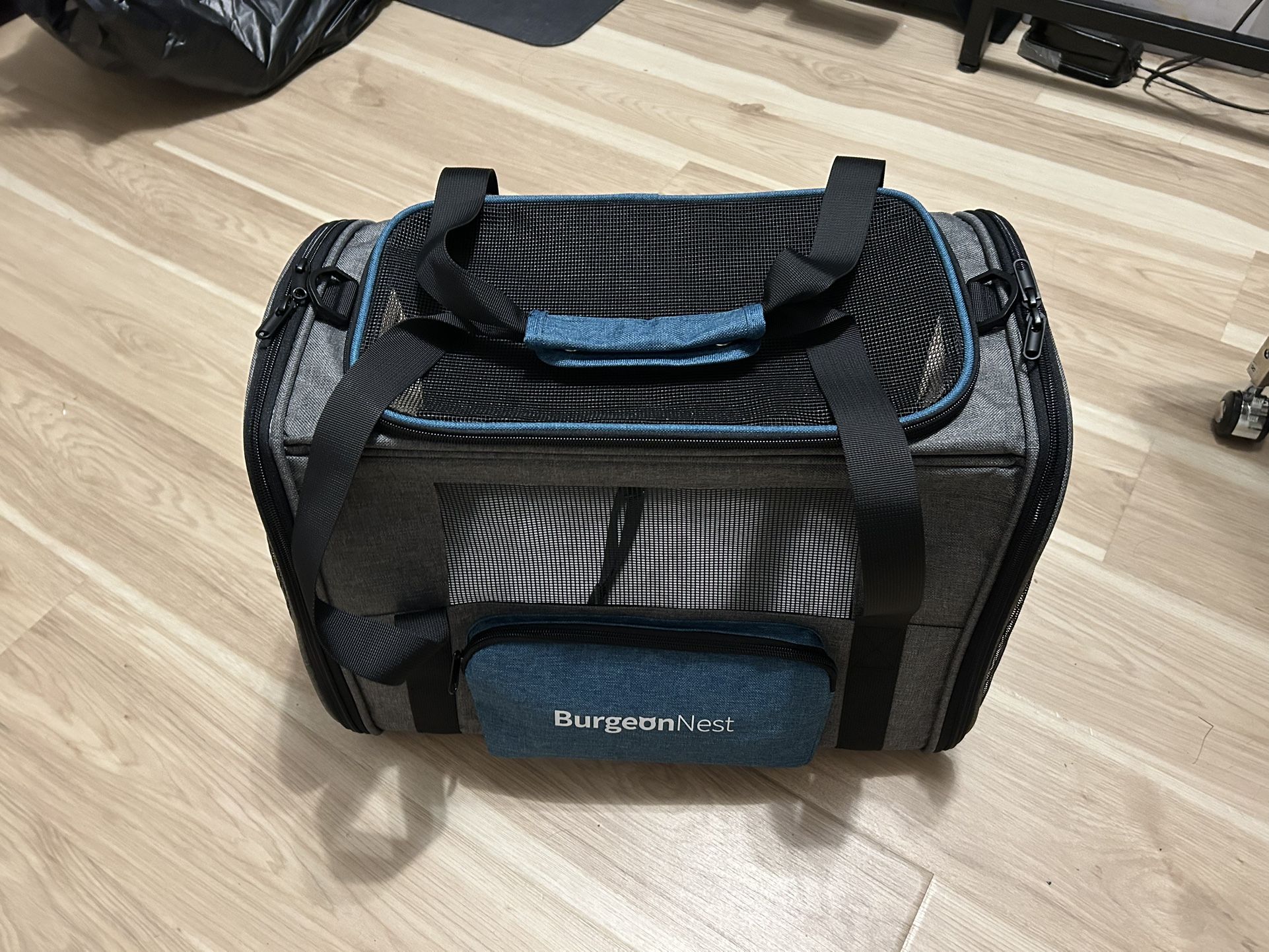 The BurgeonNest Collapsible Pet Carrier is a versatile backpack carrier designed for medium pets under 25lbs, with a focus on providing comfort and convenience for pet owners. Made from durable cotton material and manufactured in the United States, this carrier features four windows for easy visibility and airflow. Perfect for small dog breeds like Chihuahua, this collapsible carrier is a practical solution for pet owners on the go, ensuring their furry companions are safe and secure during travel. Dog Carriers for Medium Dog: The large pet carrier, measures 19.3"L x 12"W x 13.4"H, fits for small dogs,large and medium cats. Perfect for pets up within 17.5" x 11" x 12"(smaller than product) and weight up to 25 lbs; ideal for travel/ vacation/ leisure/ hiking/ car/ outdoor activities etc. Well-made Dog Carrier: With upgraded memory metal for sturdy frame, this dog carriers for small dogs does not collapse. Made of breathable fabric, dog carrying bag has 3 doors to open, it is more convenient to put your dog cat in or out. Plush cushion with sturdy bottom inserts ensures comfortable environment for pets. No-escape Travel Cat Carrier: Secured with against-slip zippers, your pets can't escape easily by pushing against the zipper from the inside. Pet bag has 4 mesh windows , which can bring more fresh air and also easy for you to check on your furry friends. Large Unique Storage bag : The large dog carrier with bright-blue Storage bag, very fashional dog carrier bag. Break the dullness! Bag on the side can hold garbage bags, food or folding bowl for your pets. Portable and Washable: If you are tired of carrying handles, the adjustable shoulder strap help you hands-free carrying. and makes it the most convenient dog carrier bag during your travel.