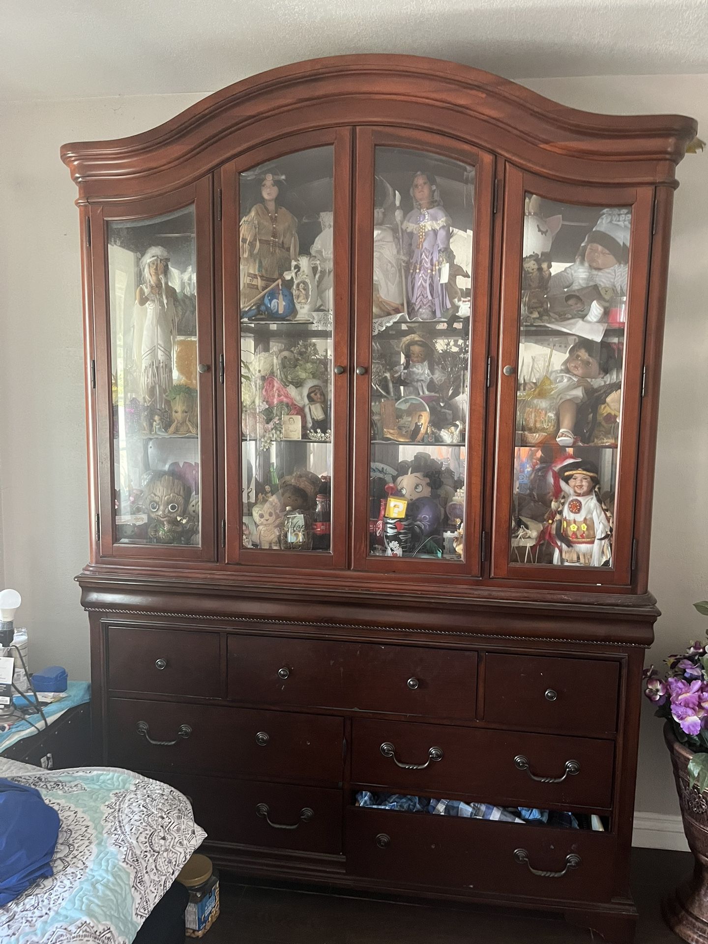 Cherry brown curio hutch top with a small crack on bottom I glued it looks good and glass shelf’s are new it has a light on inside top and item in not for sale just the hutch some paint will look nice