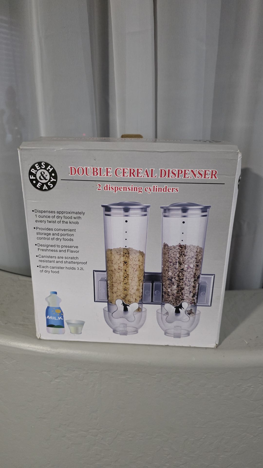 New in box double cereal dispenser by fresh and easy. Each cylinder holds 3.2L and dispenser 1oz dry food. Pick up only at Gary and Empire. No holds. First come, first served.