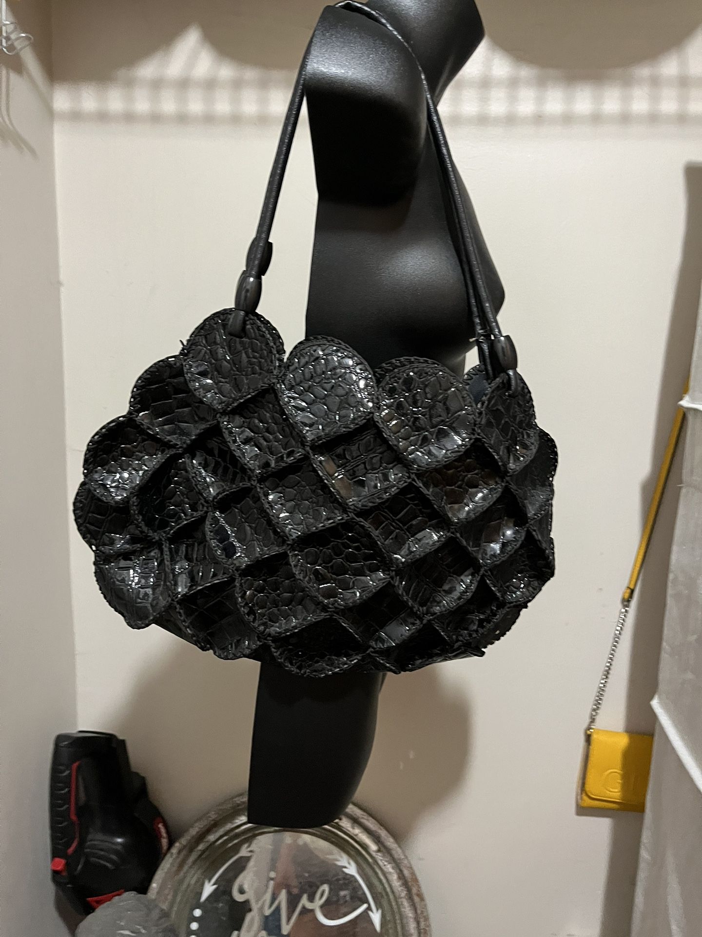 Super cute design on this, fake snake skin design silk lining, no name, in it making me think this is handmade super cute though