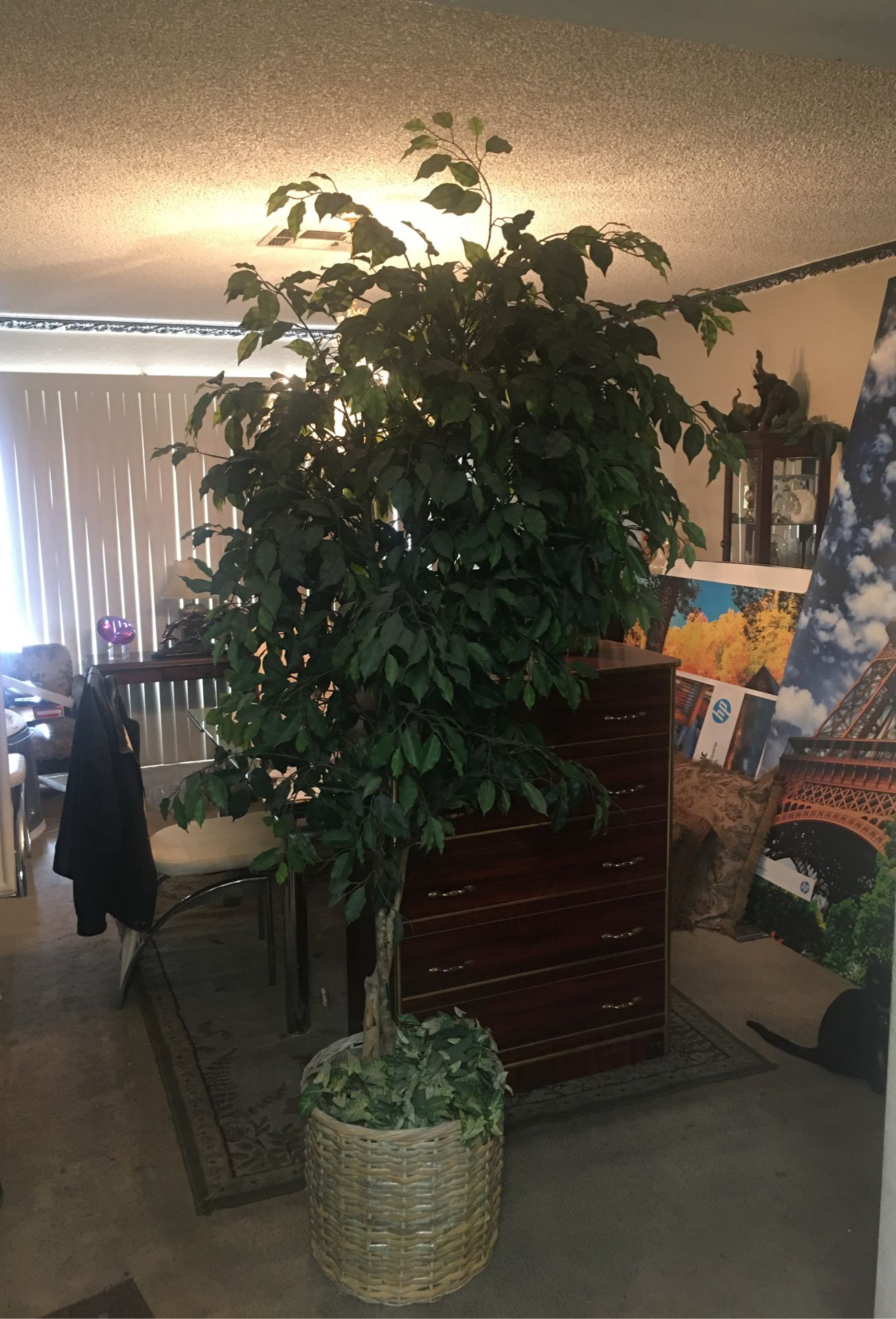 This artificial tree is 7.5’ tall and is in a wicker basket with artificial plants as shown in the photos. The leaves are dusty from being stored.