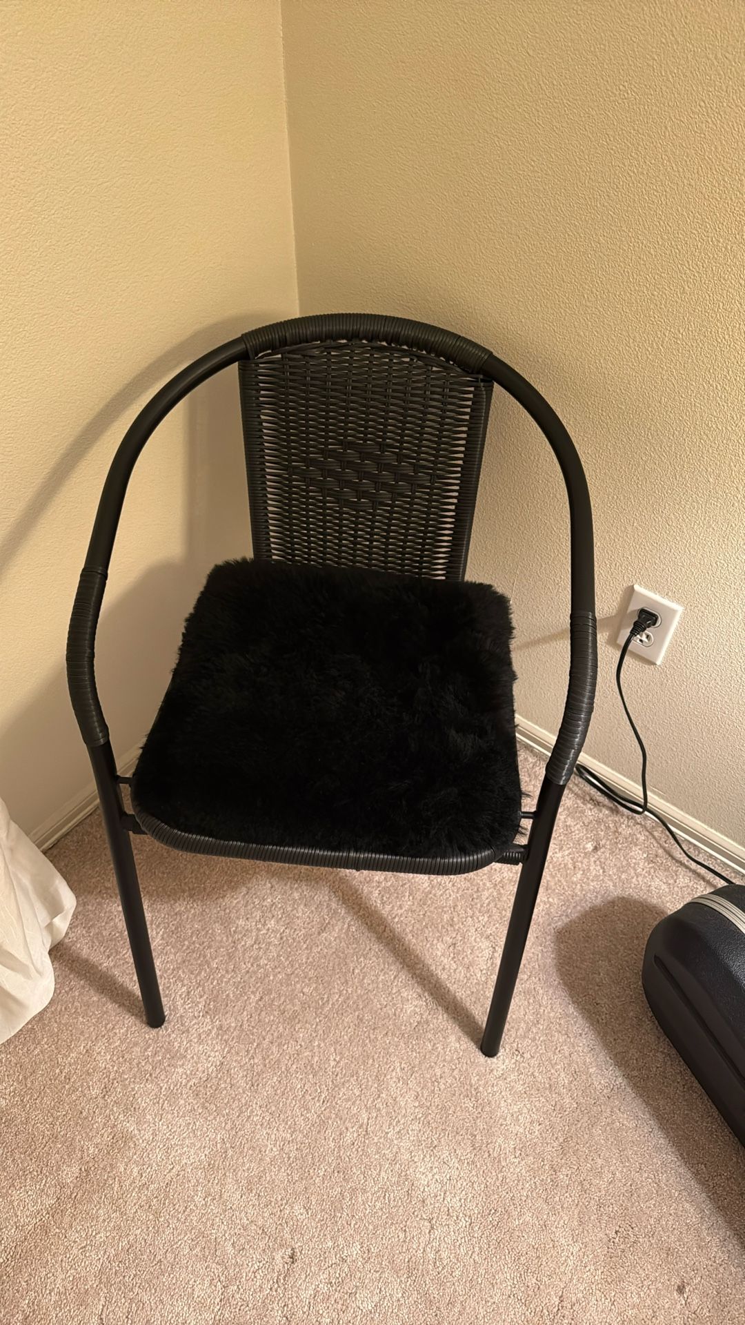 Chair is rattan and frame is metal. Seat cover is real sheepskin and will come with the chair. No damage or other issues.
