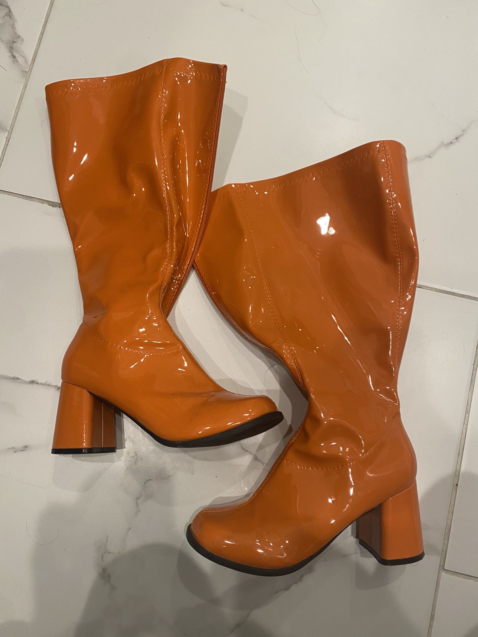 Gogo boots. Orange gogo boots. Worn once. Perfect for Halloween. A couple black scuffs on the inside of the front of the heel. Pictures to see. You can probably even take off if you needed.