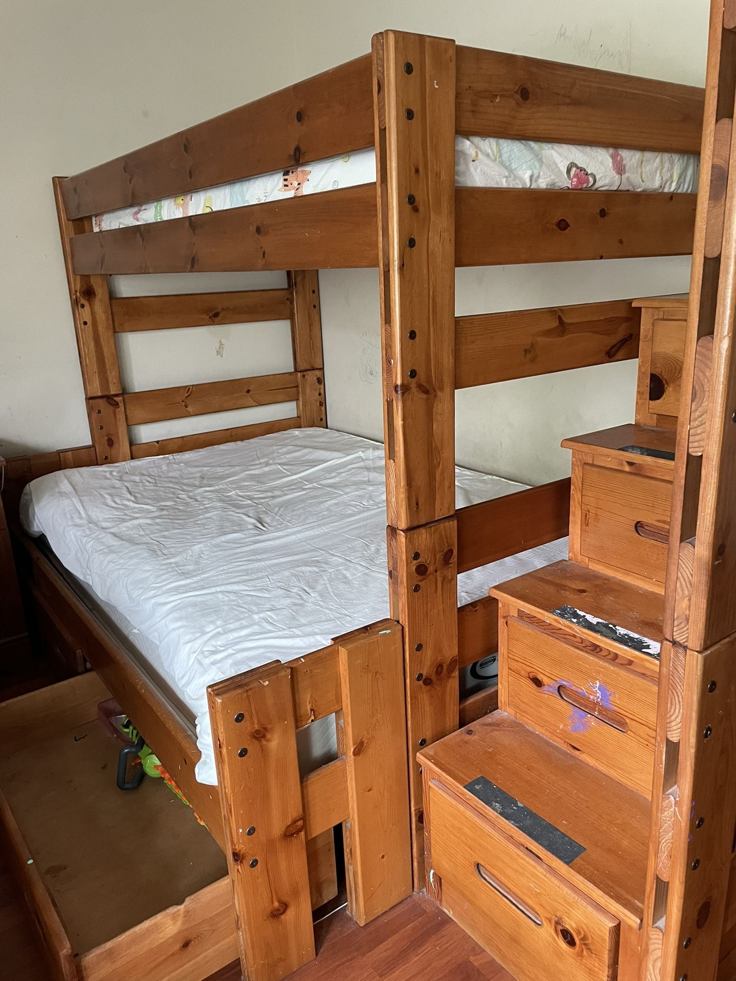 Bunk bed made by hard wood with drawers ( two under the bed, four on the side)