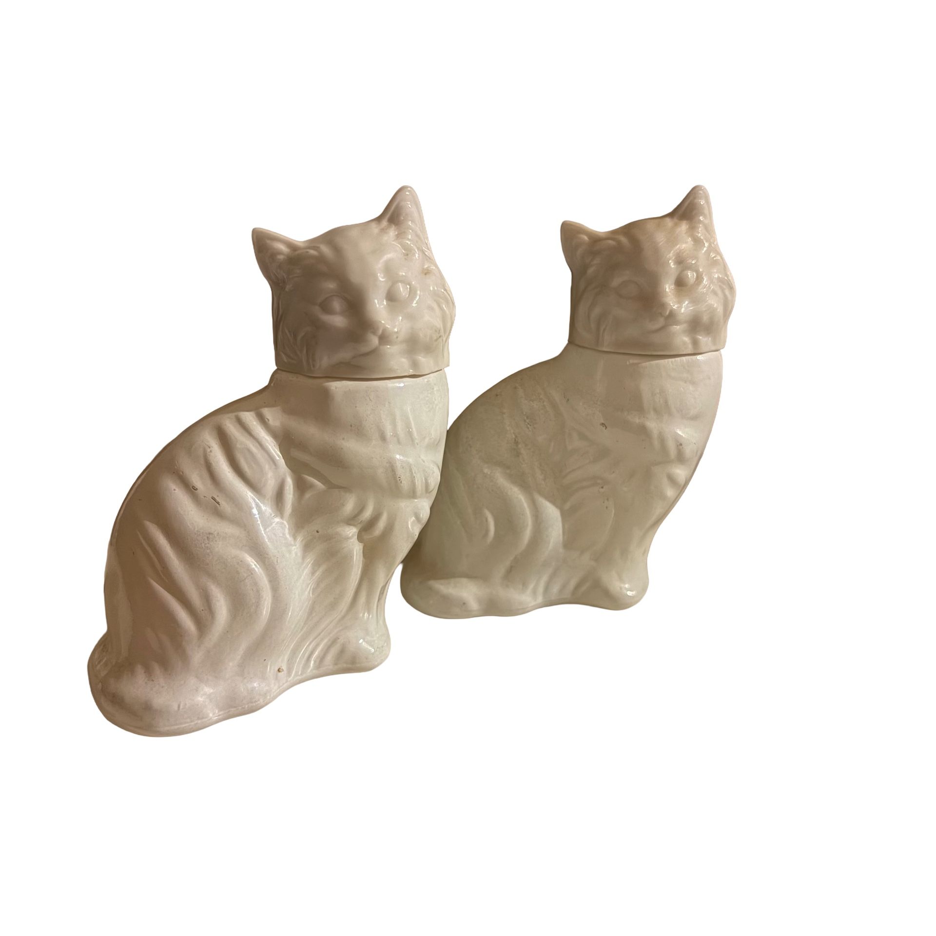 This is a pair of vintage Avon collectible perfume bottles made of white milk glass. Each bottle is shaped like a seated cat and originally held 1.5 fl. oz. of "Somewhere" Cologne. The heads of the cats serve as the removable caps. Both bottles retain their original bottom labels identifying the scent and manufacturer.