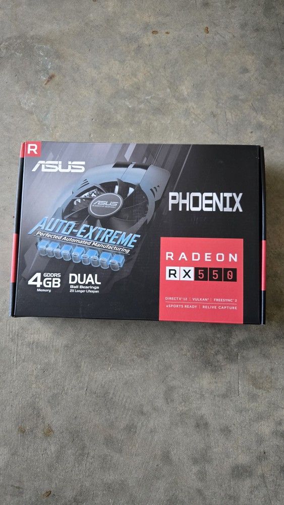 Selling like new condition ASUS Radeon RX 550 graphics card. Used one day for home lab and no longer needed. - 4GB GDDR5 memory - FreeSync technology - HDMI, DisplayPort, DVI-D outputs - Compact - Phoenix design - IP5X dust-resistant fans - Dual Ball Fan Bearings Great for: - Entry-level gaming - Home theater PC builds - Multi-monitor setups - Upgrading older systems - Energy-efficient computing Features: - DirectX 12 support Excellent condition - barely used. Cash only, local pickup