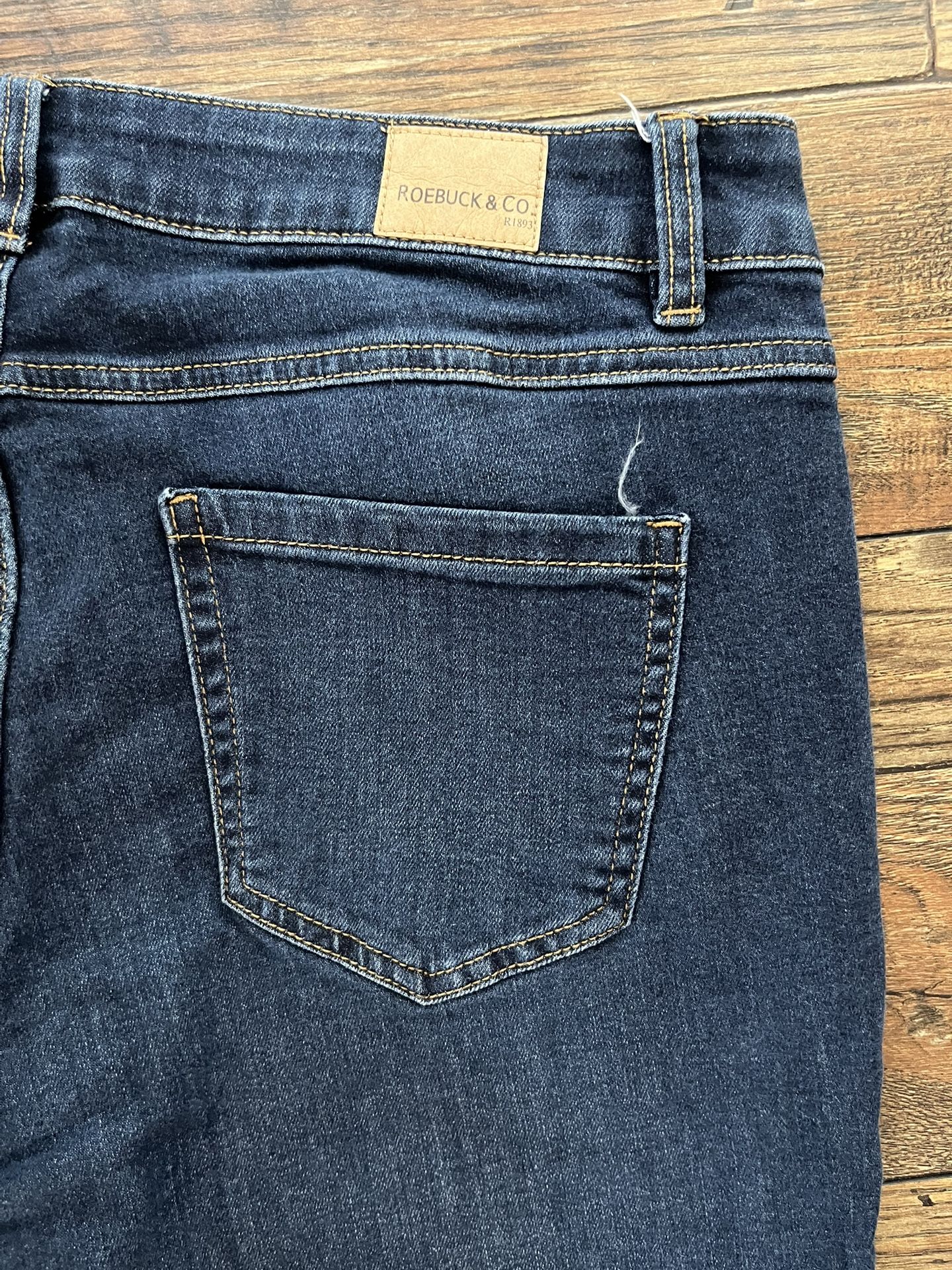 Experience timeless style with Roebuck & Co. women's straight leg jeans in a classic dark blue. Perfect for versatile wear.