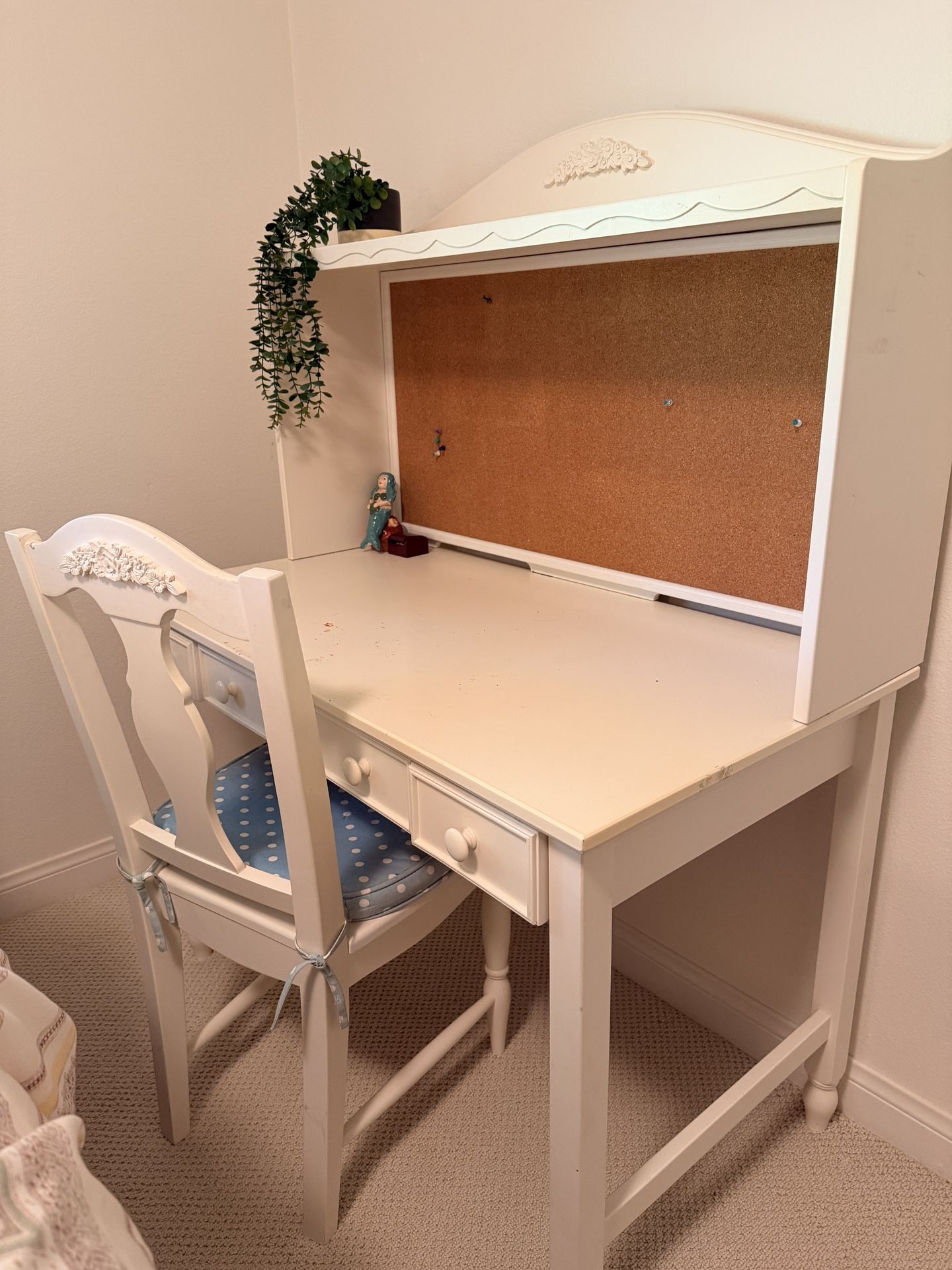 Cafe Kids set up! High quality three piece white desk, hutch with bulletin board and solid wood chair with removable cushion. Good condition, a few marks on desk top. Can be easily painted or covered with desk mat. New was $1200!