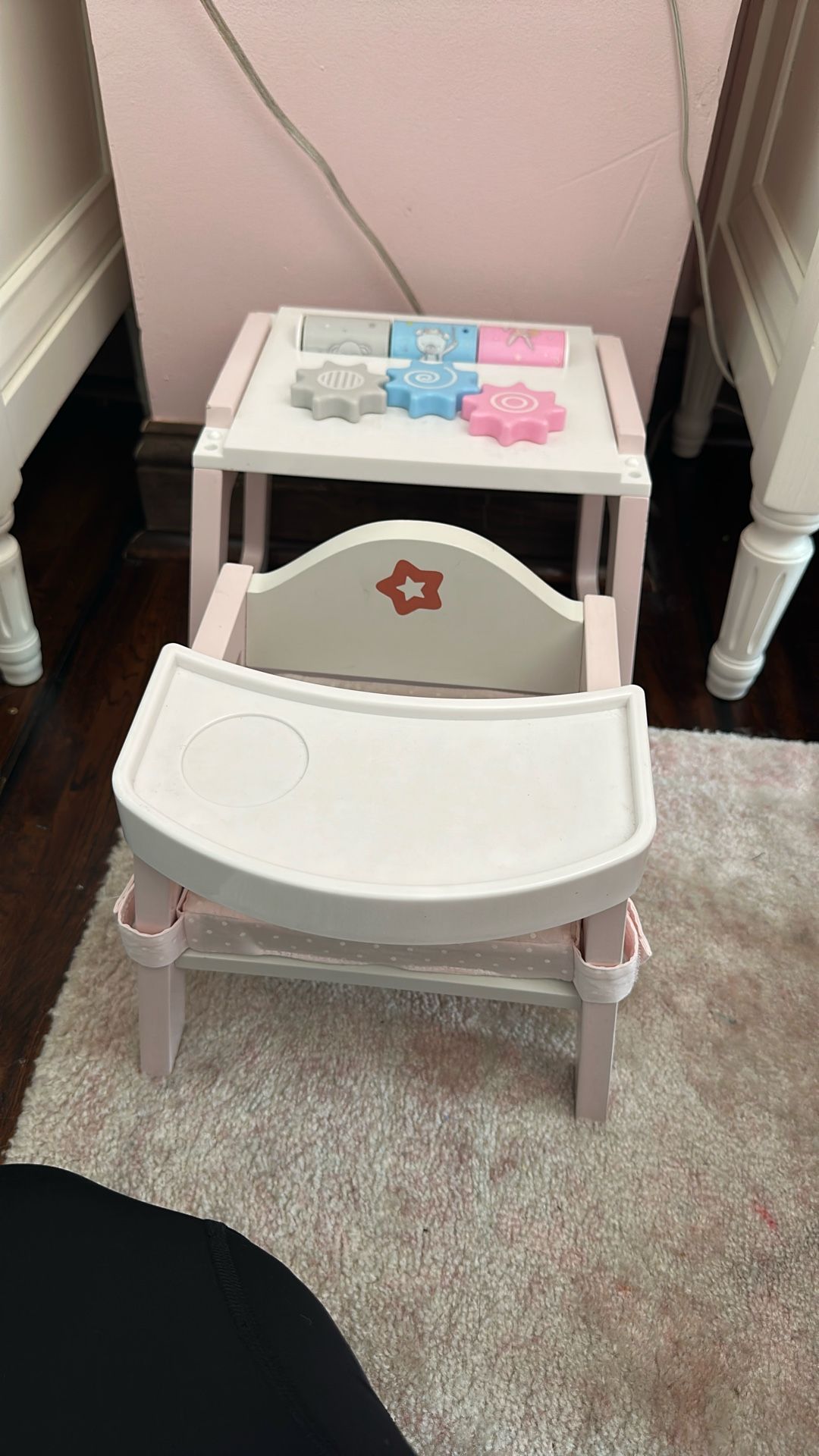 Adorable wooden high chair with soft polka-dot seat cushion and spinning gear play features! Doubles as a little play table when flipped. Sturdy and clean Gently used Perfect for pretend play and fits most dolls (including Bitty Baby-size) Comparable ones retail new for $65. Pickup at the 25th District Police Station parking lot (across the street) Best offer welcome!