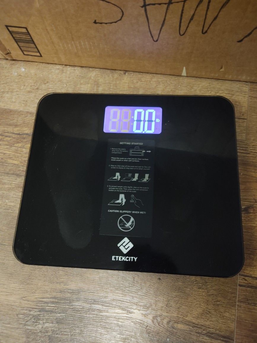 Model: EB4410B Lightly used, works great and fully functional. Clean and well cared for with minor signs of use only. (Can meet locally) Highlights: - Digital Body Weight Scale - Sleek Black Tempered Glass Design - High-Precision Sensors - Easy-to-Read LCD Display Features: Accurate Weighing High-precision sensors provide consistent and reliable weight measurements. Sleek Glass Platform Durable tempered glass surface with a slim, modern black design that fits well in any bathroom. Easy-to-Read Display Large LCD screen displays weight clearly and is easy to read at a glance. Auto Functions Automatic step-on activation and auto shut-off for convenience and battery efficiency. Compact Design Low-profile build makes it easy to store when not in use. Weight Capacity Supports up to 400 lb