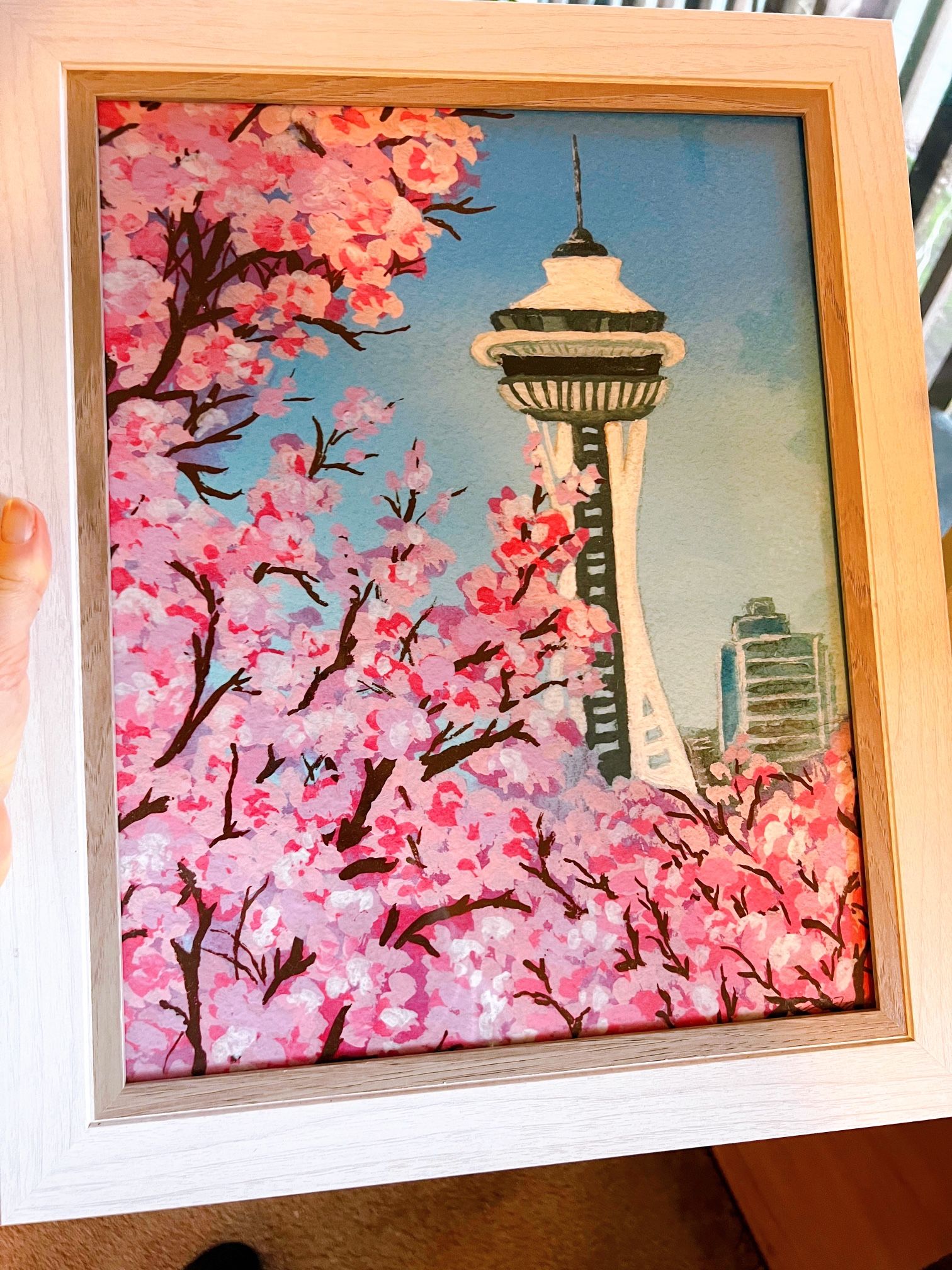 Beautiful painting of cherry blossoms with a city tower, framed. From a local artist, brand new, never been hung. Comes with elegant wooden frame. 17”x14”
