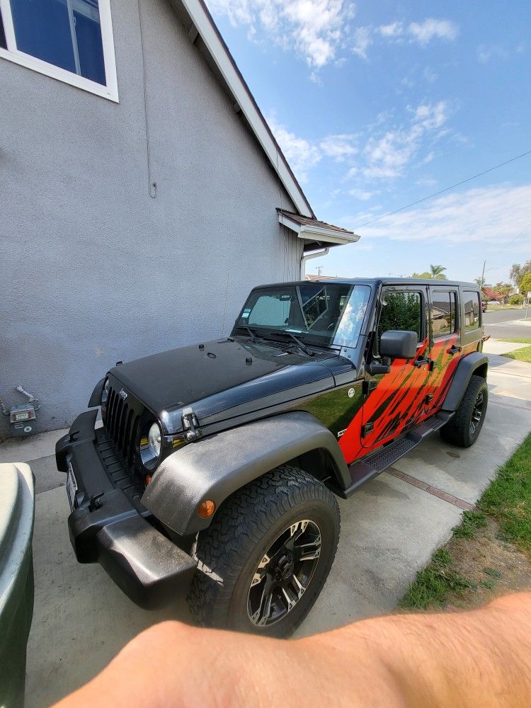 Jeep Wrangler Unlimited Sport 2012 with 4-wheel drive. Slightly driven in great condition. The red stripes and extra are all decals that you can easily peel off.