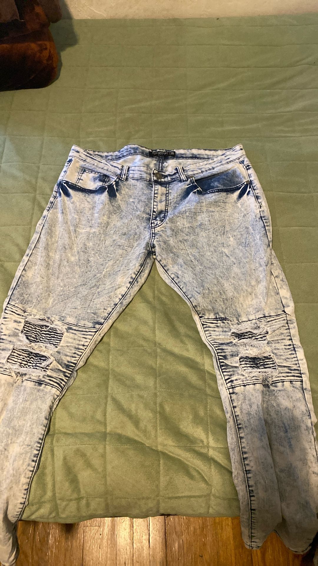 Fading Light Blue Jeans Size 36. Only worn about 3 times, has ripped design on the knee portions, asking price is 30 bucks